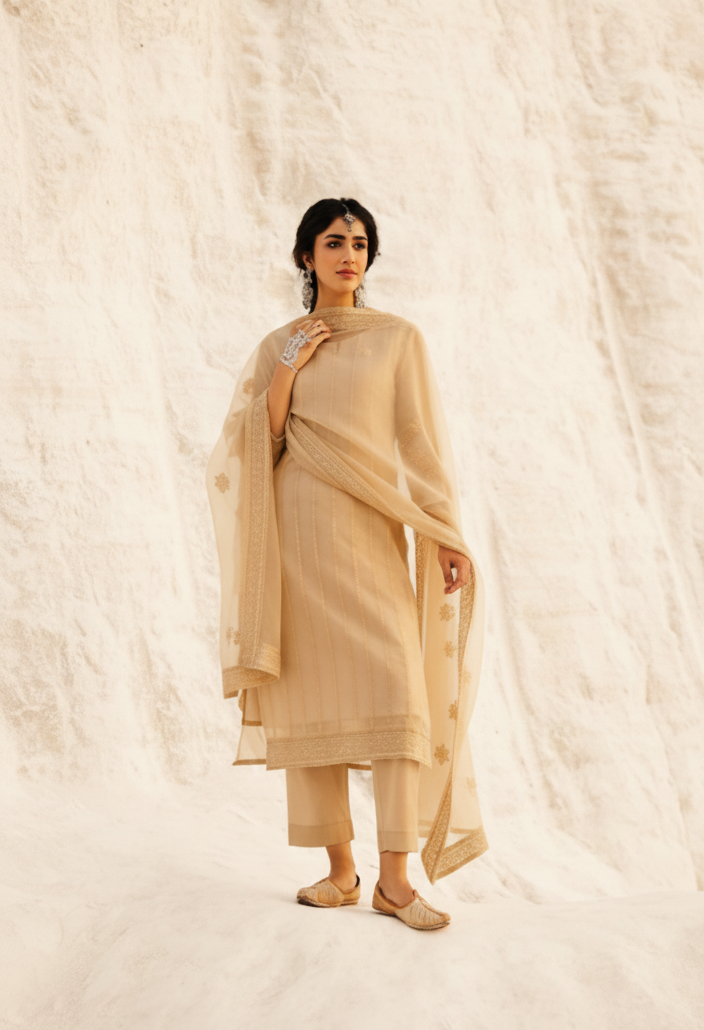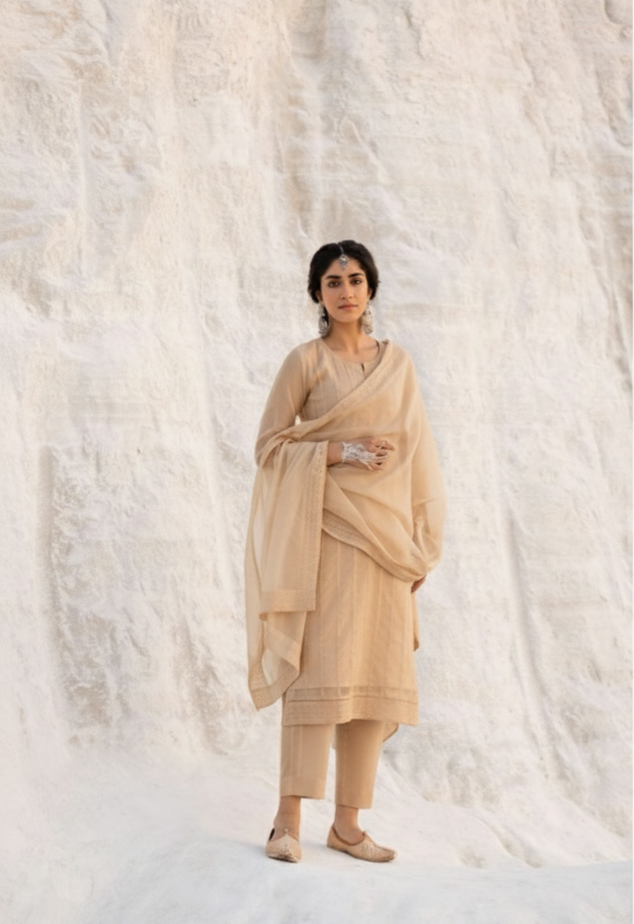 Beige Mul Chanderi kurta with intricate Chikankari embroidery, paired with soft cotton pants and a delicate Mul Chanderi Chikankari dupatta