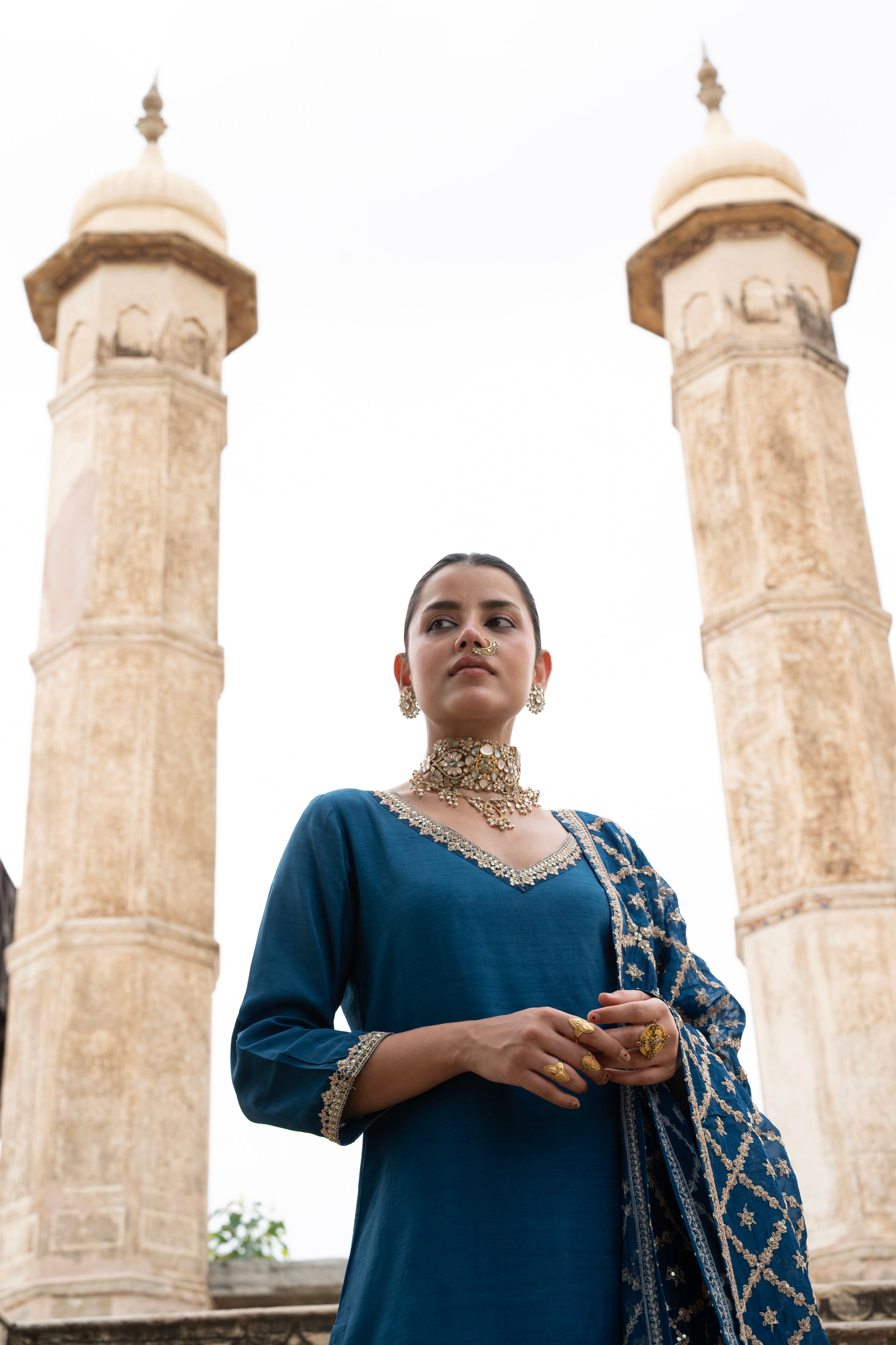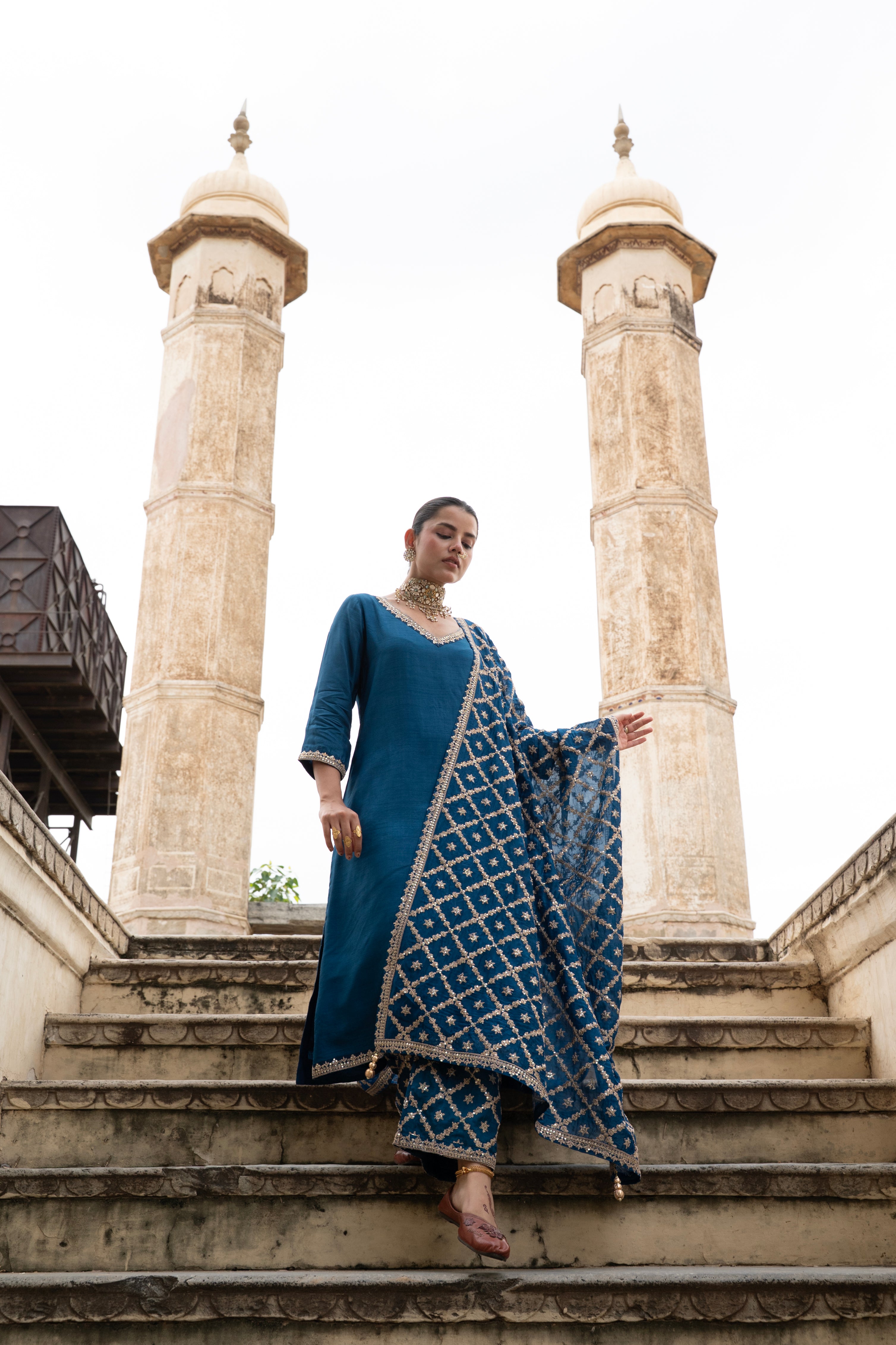 INDIGO BLUE PURE DOLA SILK EMBROIDERED KURTA SET