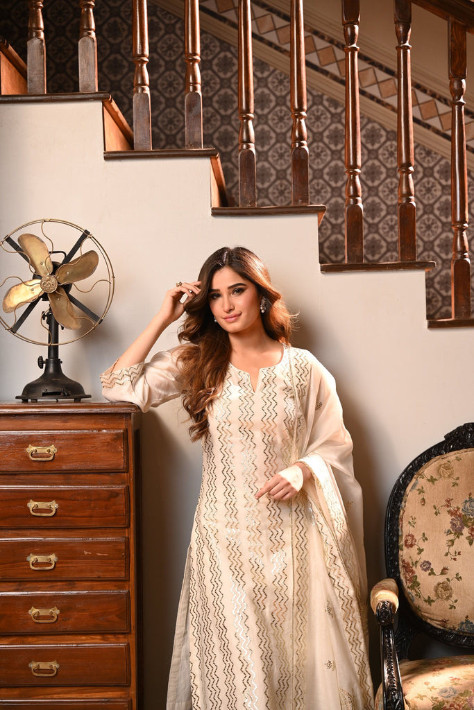 Refined, minimal, and undeniably elegant — this Pure Mul Chanderi Kurta Set. Adorned with delicate metallic thread work and subtle zigzag patterns, this ensemble is ideal for both casual grace and festive elegance.