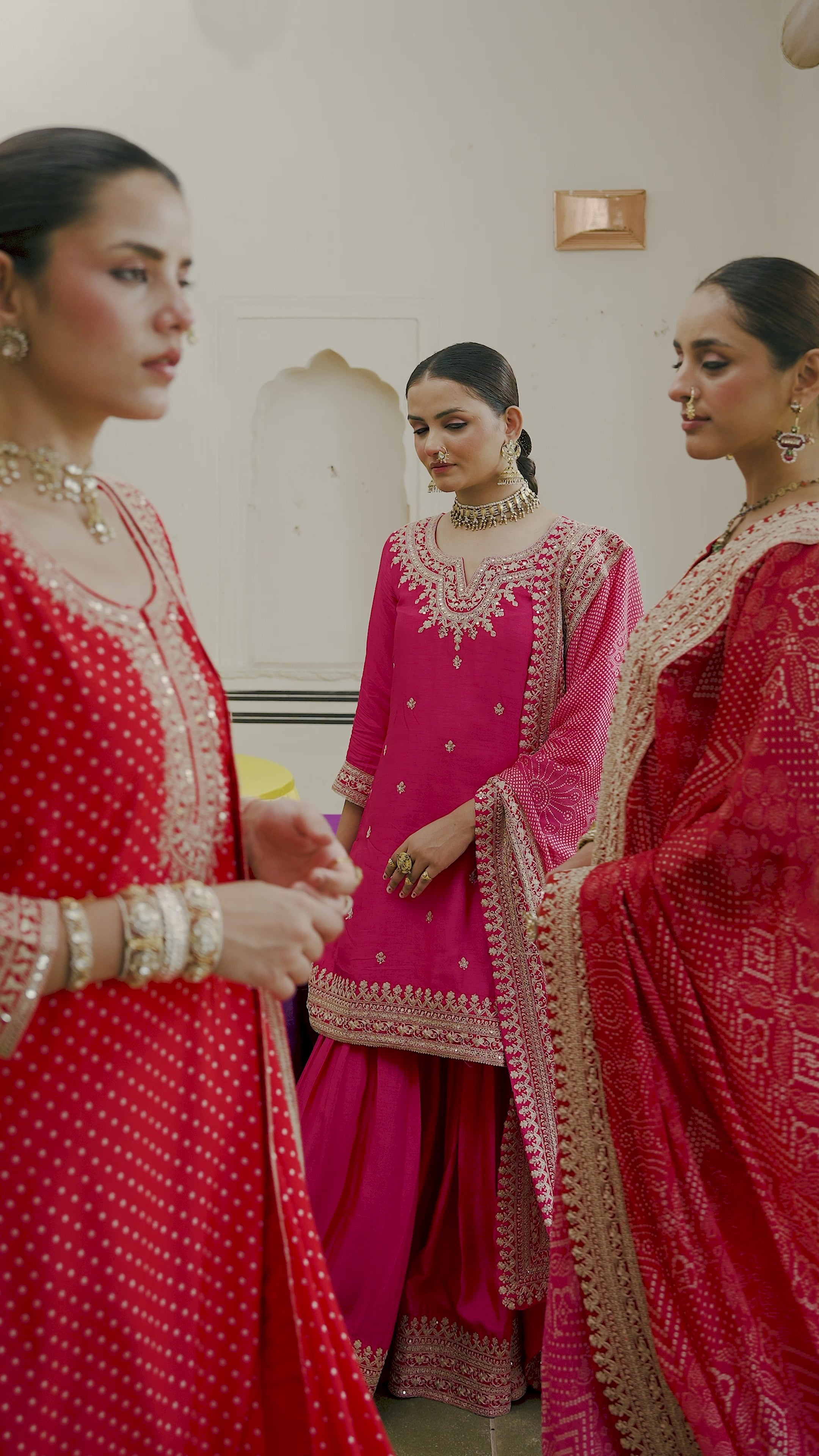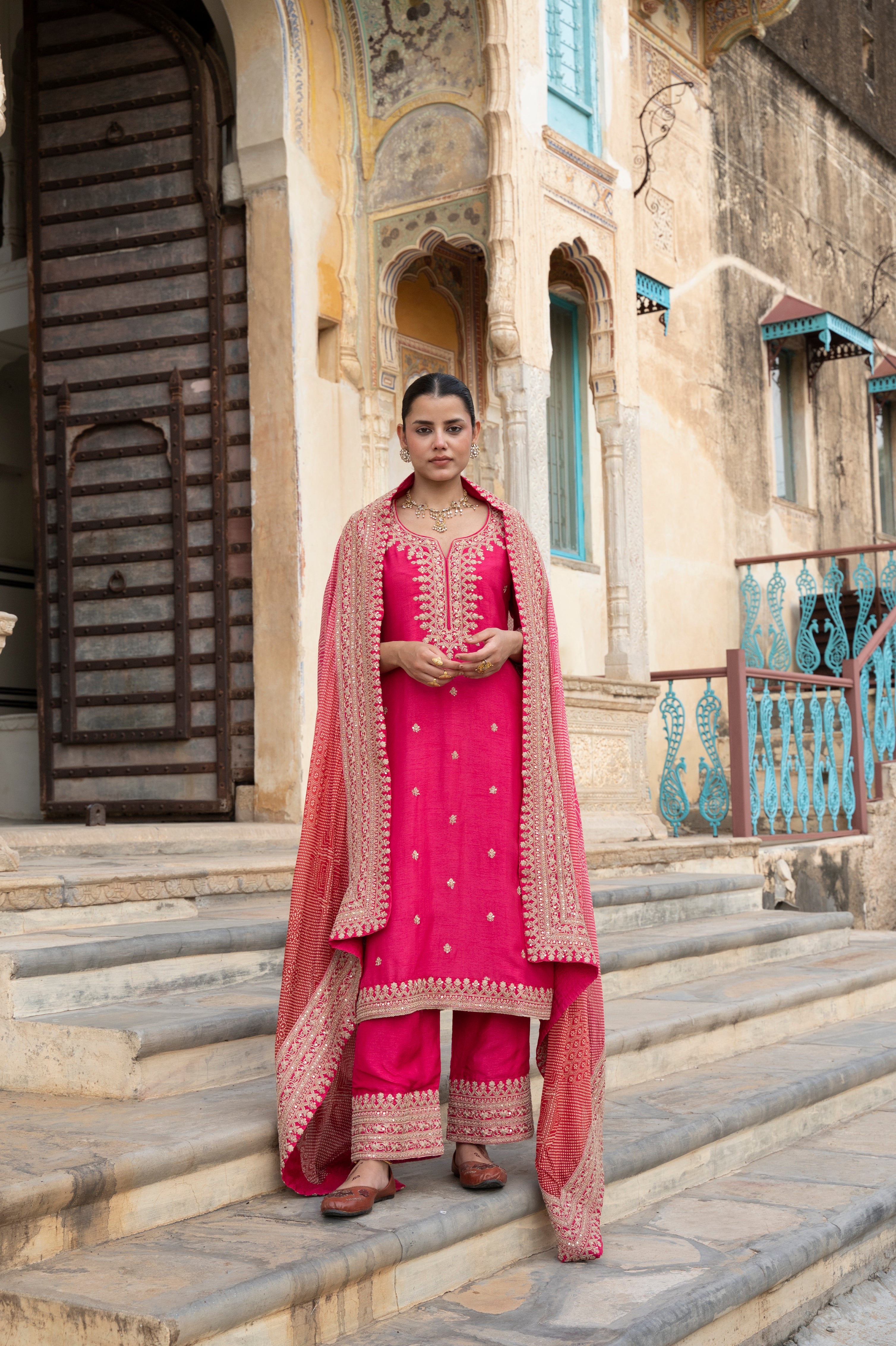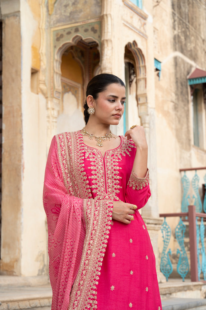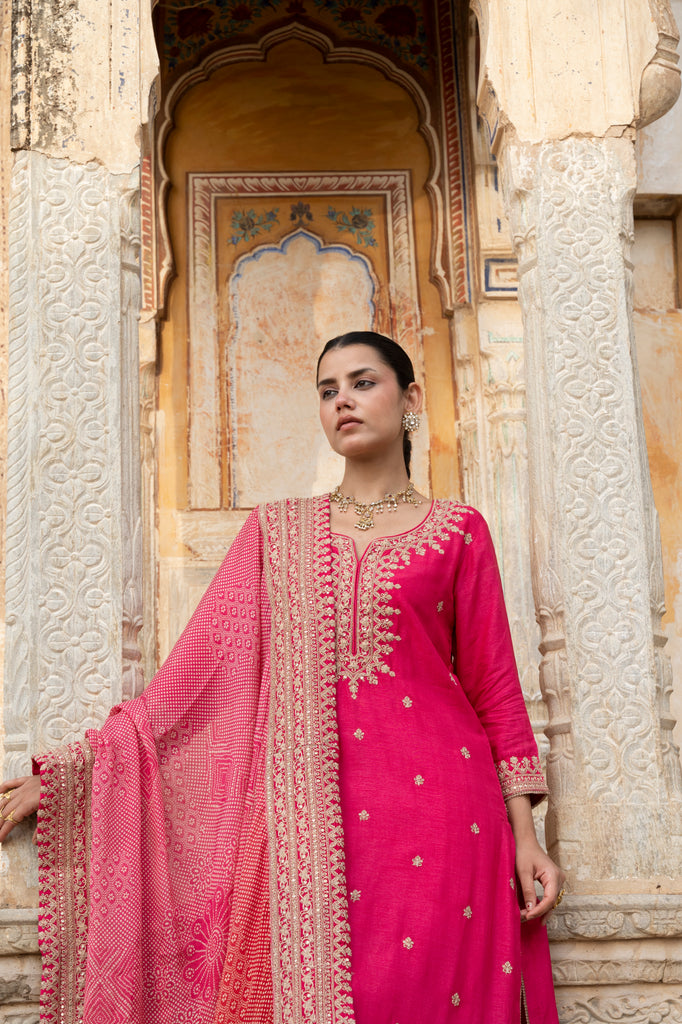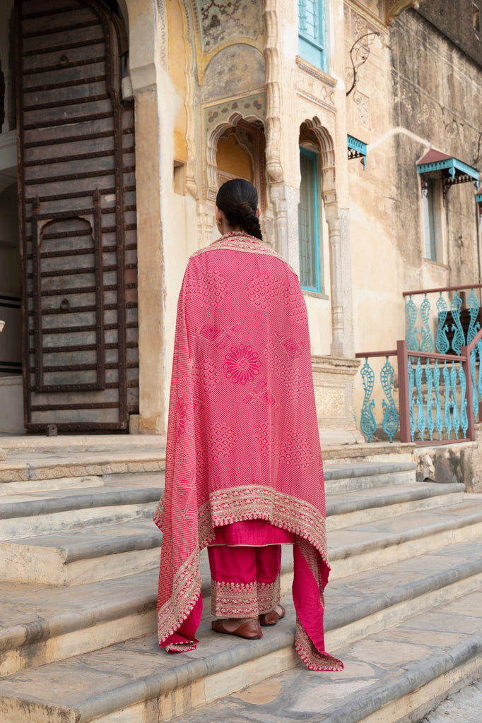 Pink Pure Dola Silk Kurta Set With Bandhani Dupatta