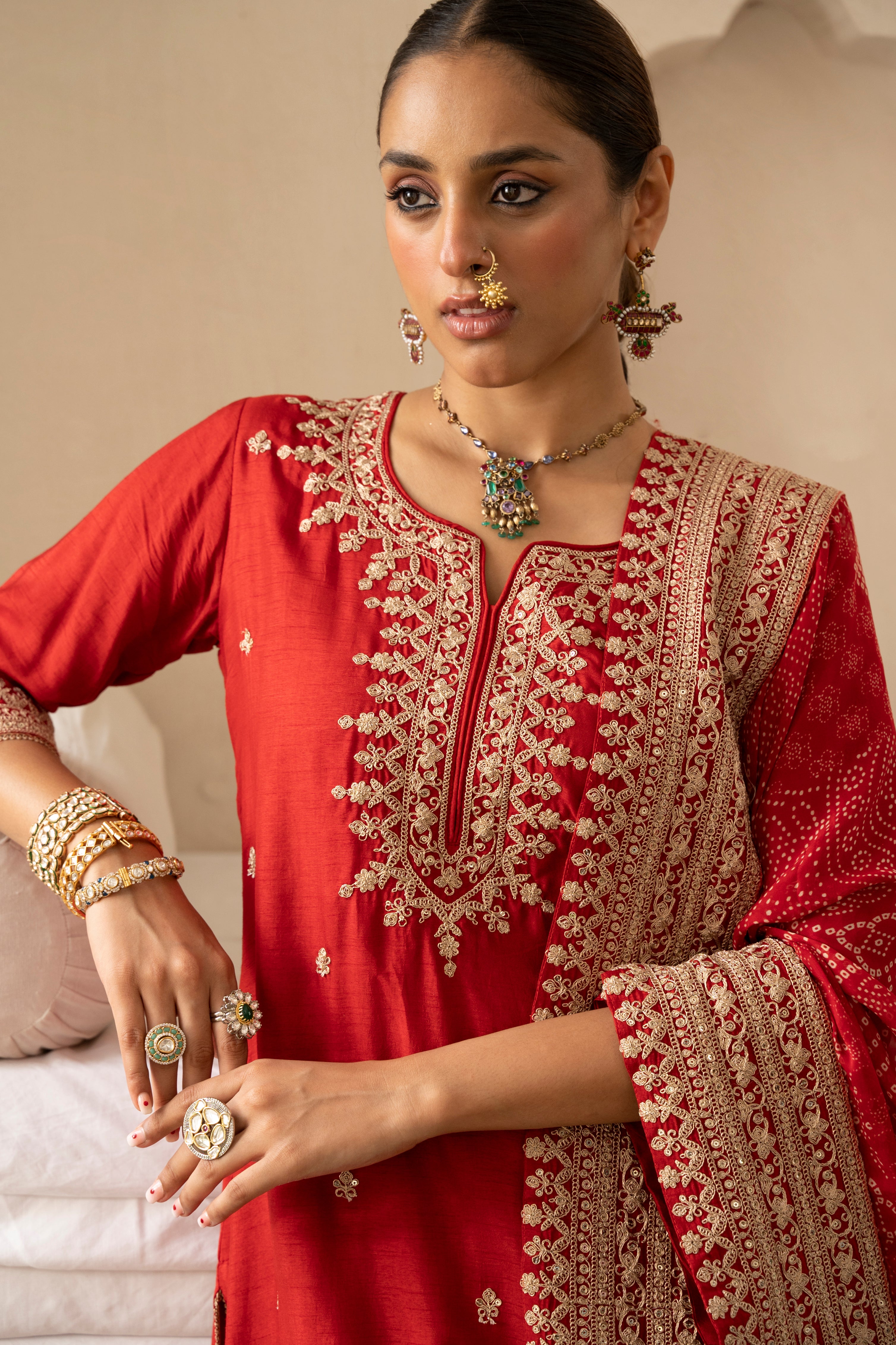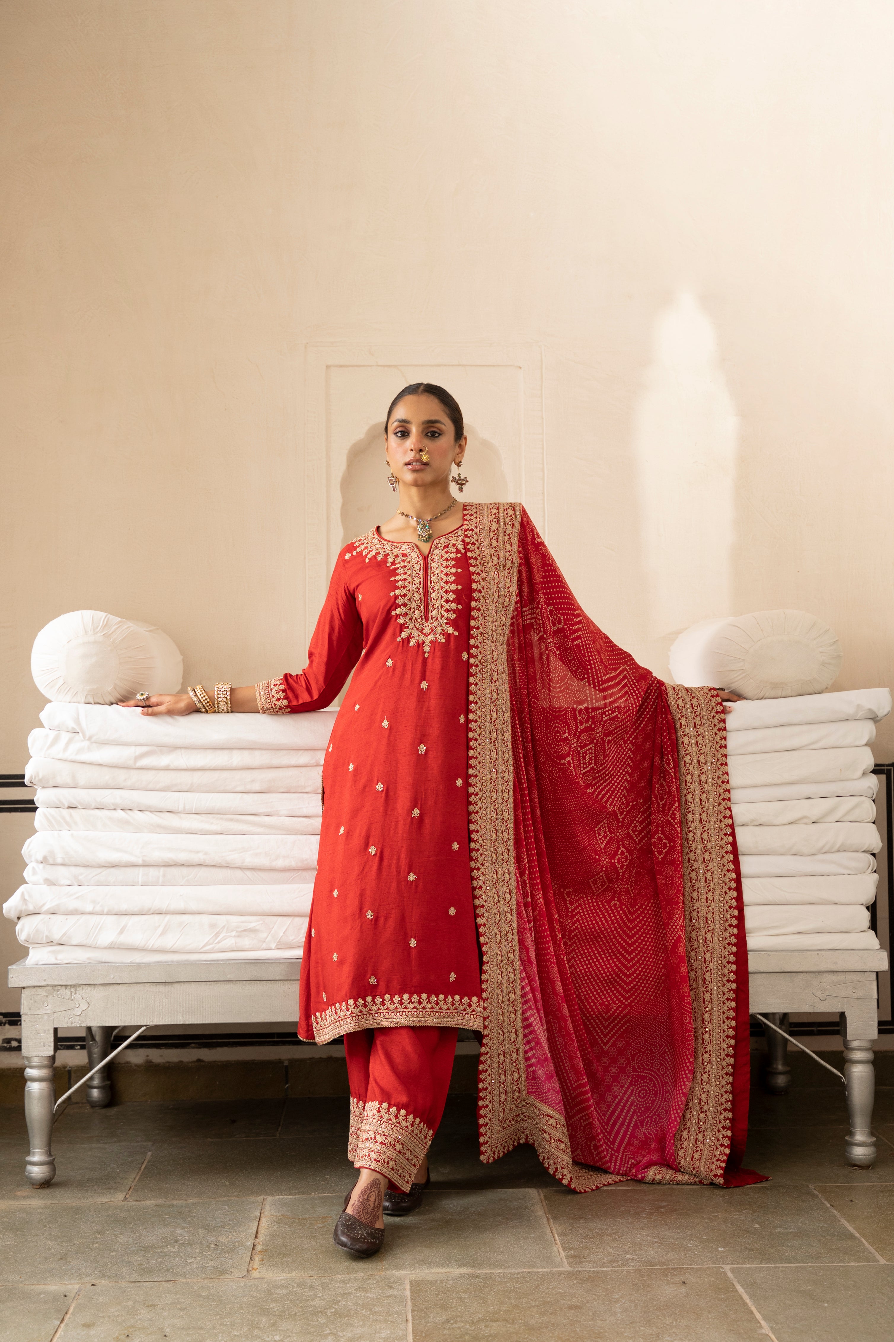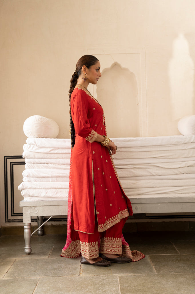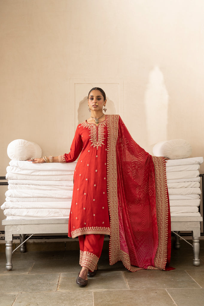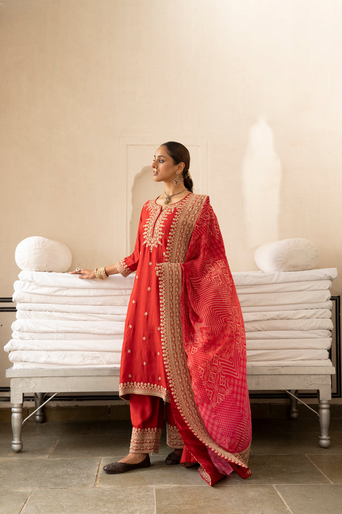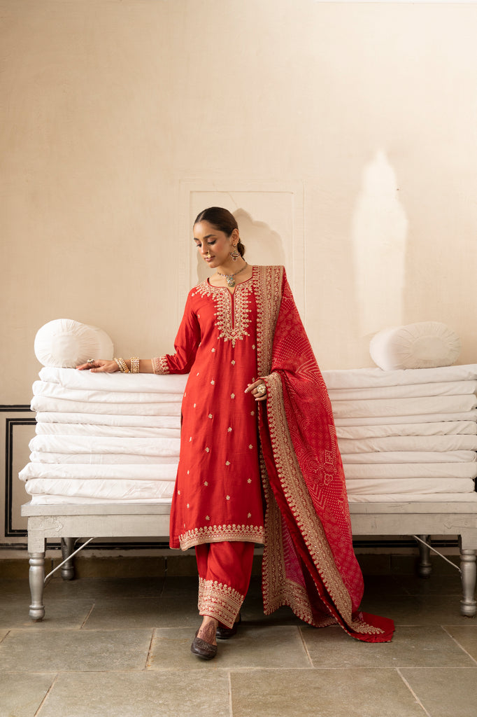 Red Pure Dola Silk Kurta Set With Bandhani Dupatta