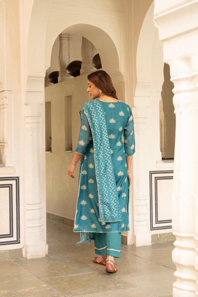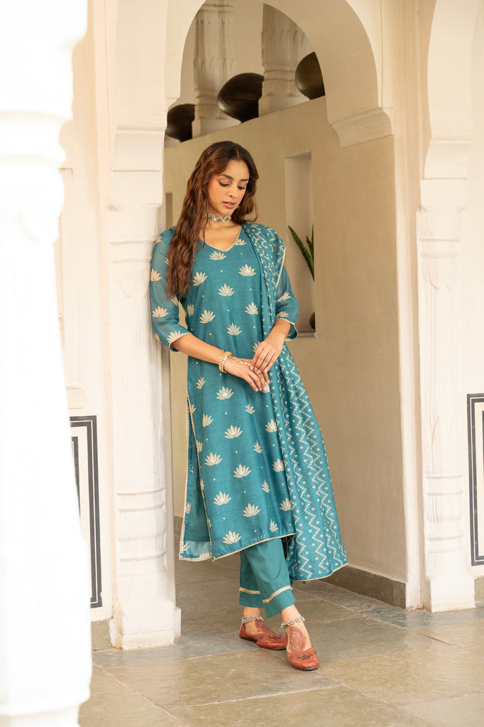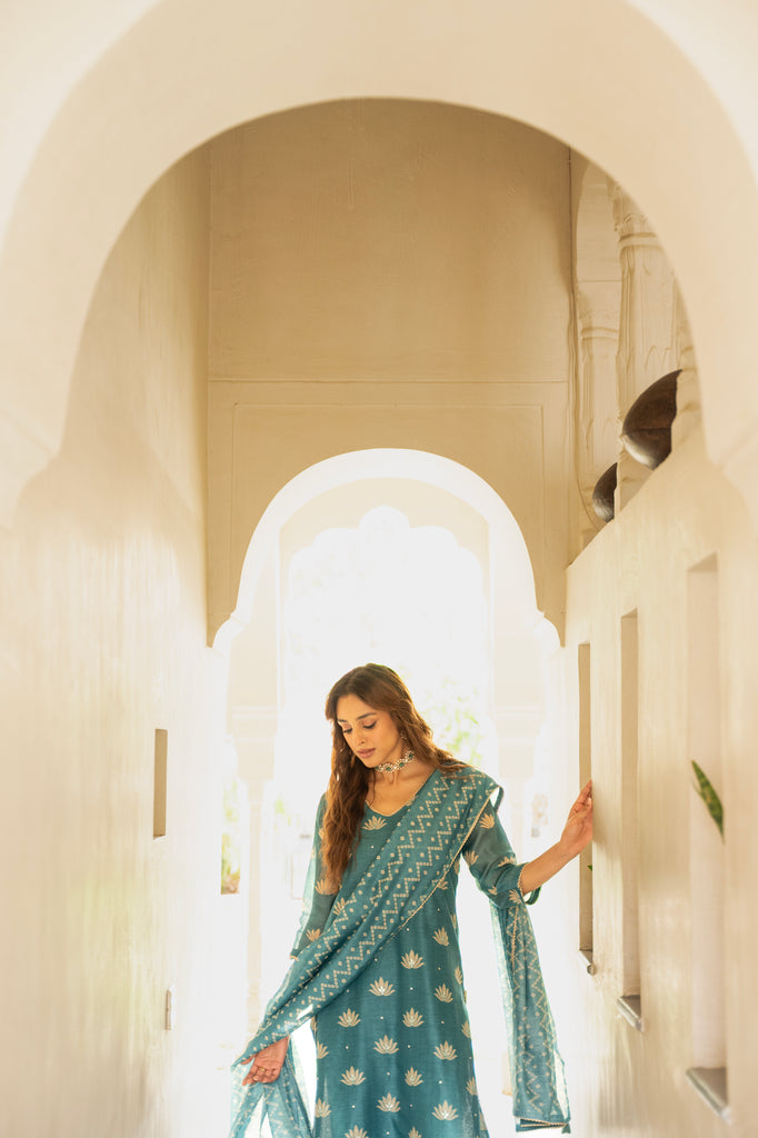 Step into timeless elegance with the Teal Blue Chanderi Kurta Set with Chanderi Dupatta, a classic ensemble reimagined with modern grace.