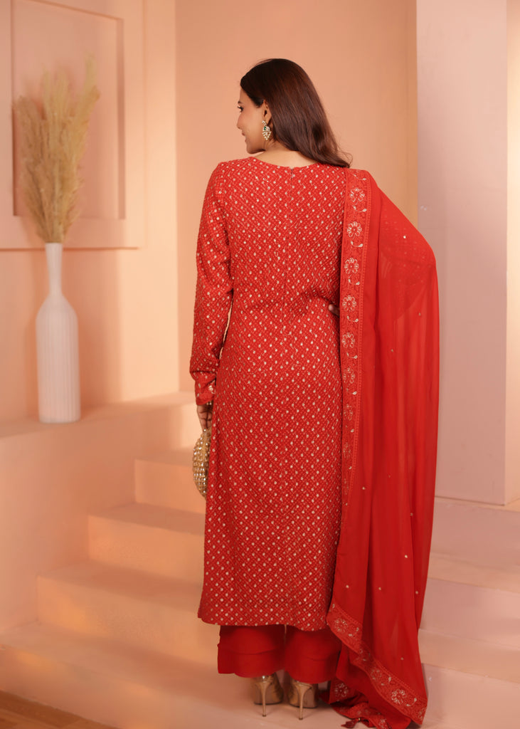 CORAL RED GEORGETTE CHIKANKARI KURTA SET