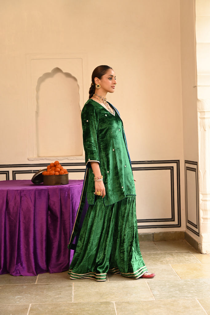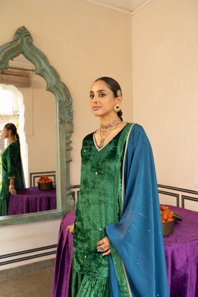 GREEN VELVET EMBROIDERED SHARARA SET