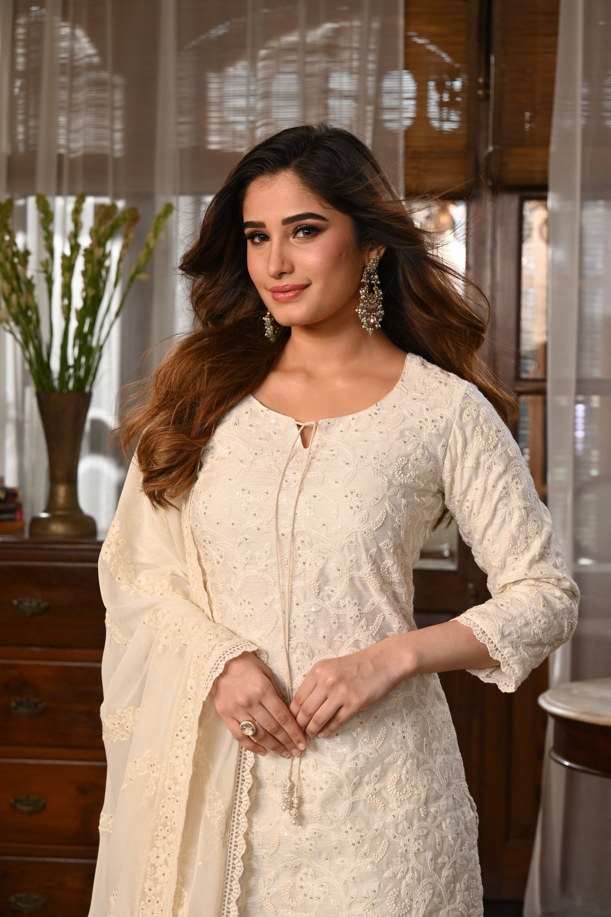 Elegance meets tradition in this beautifully crafted Ivory Embroidered Straight Kurta Set. Tailored from premium quality fabric, this three-piece ensemble features: