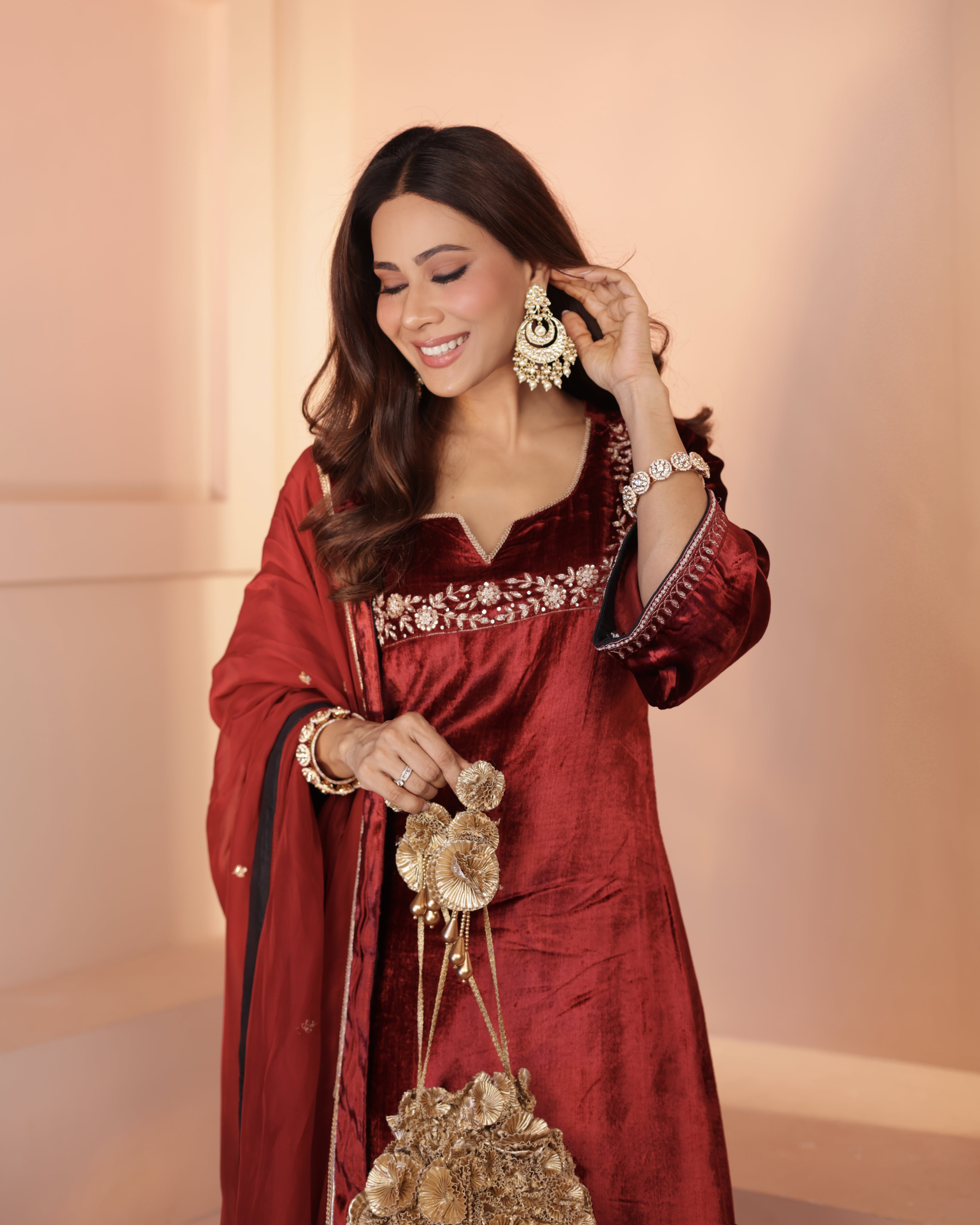 Maroon velvet kurta with bell sleeves, hand embroidery in zardozi work. Paired with velvet bottom with embroidered dupatta