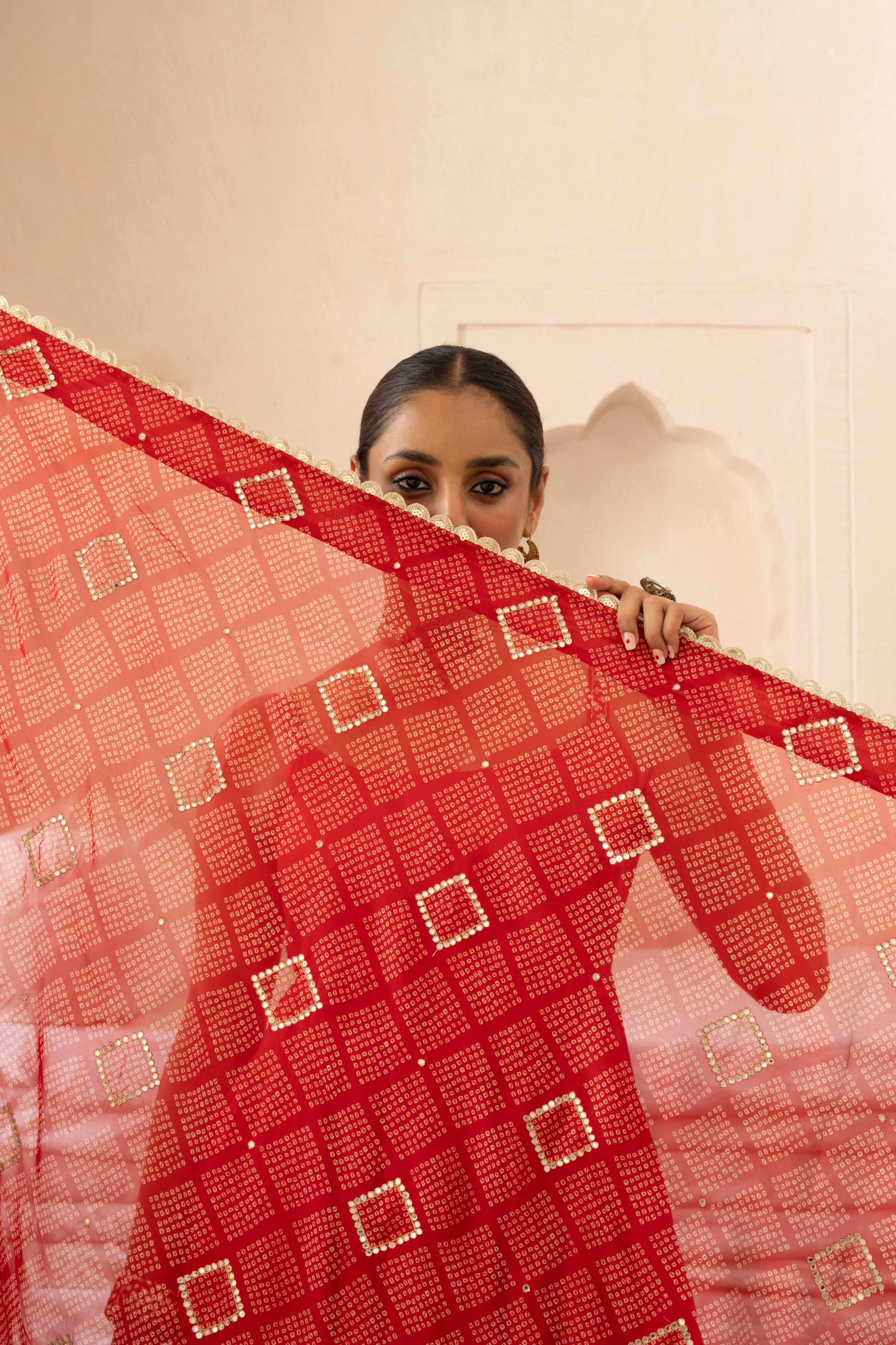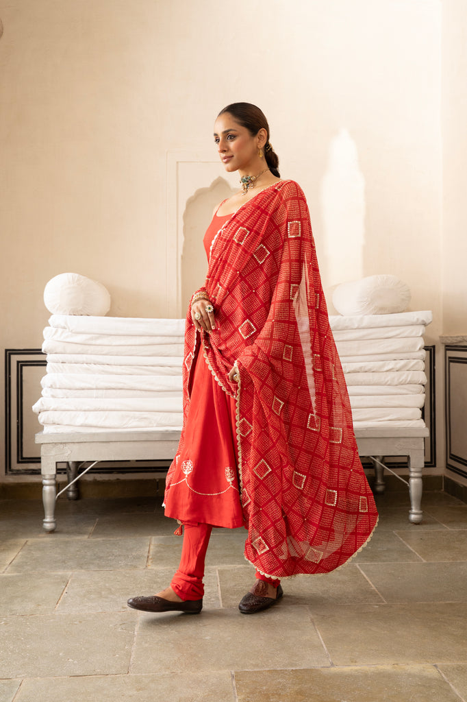 Step into timeless elegance with the Red Pure Dola Silk Kurta Set with Chinon Dupatta, a classic ensemble reimagined with modern grace.