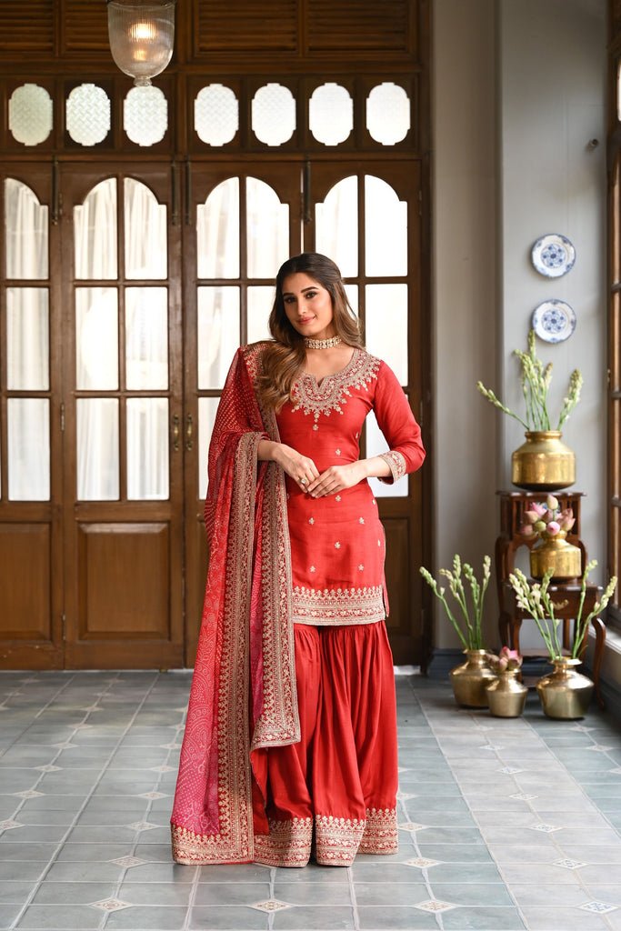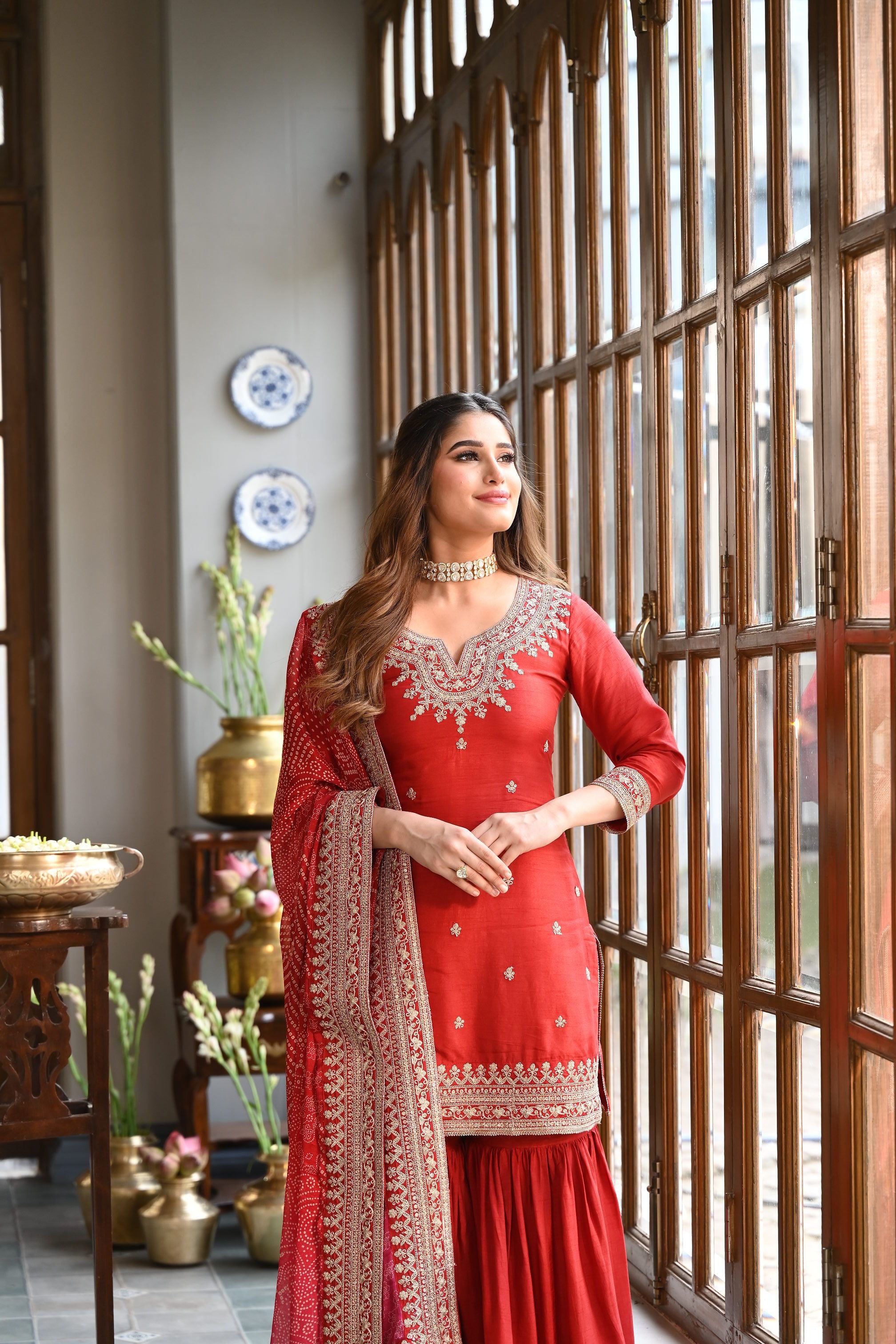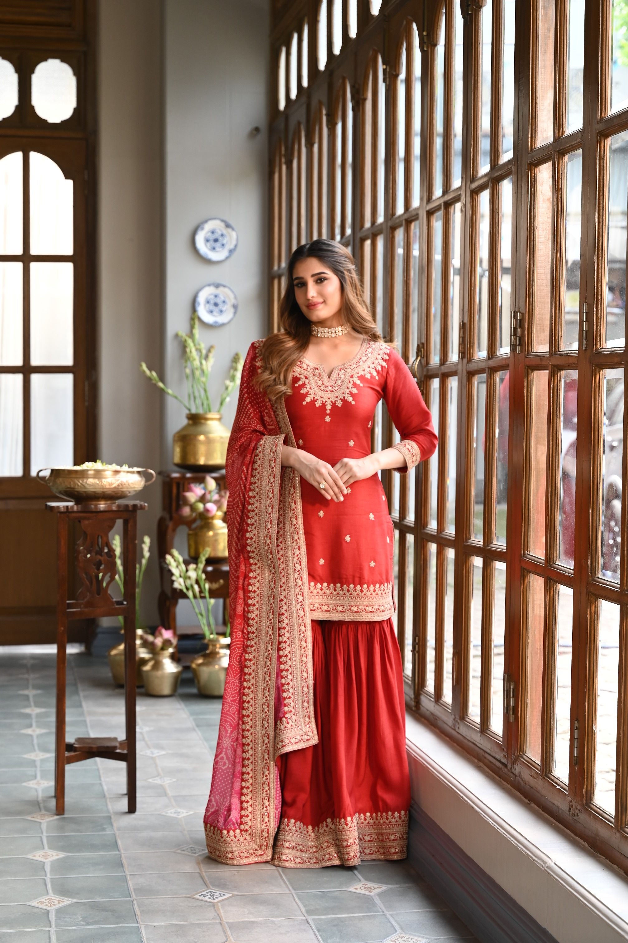 Turn heads with timeless elegance in our Red Pure Dola Silk Embroidered Gharara Set– a rich and regal ensemble designed for festive celebrations and traditional gatherings.