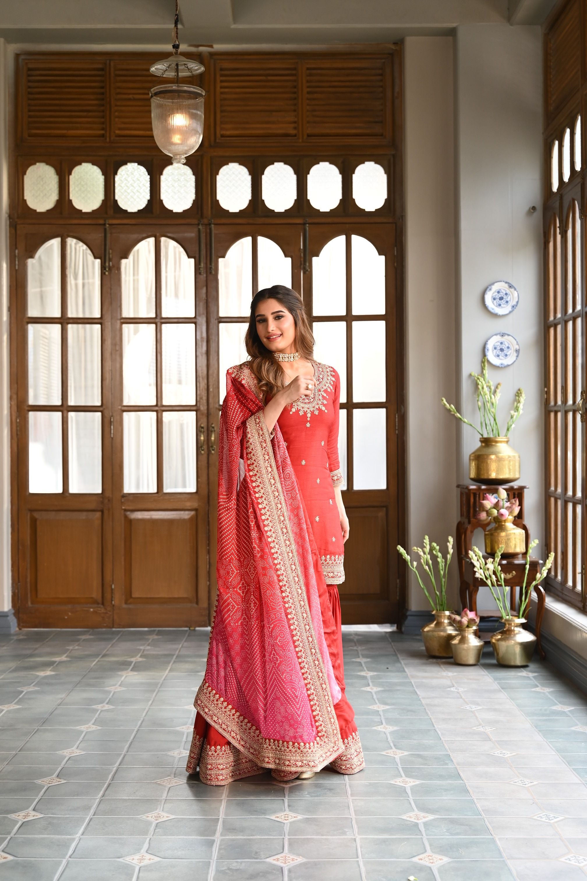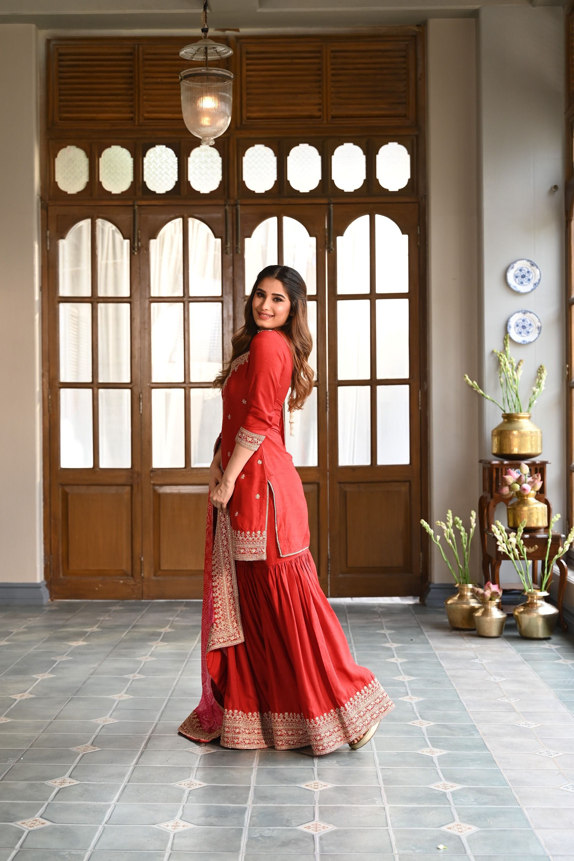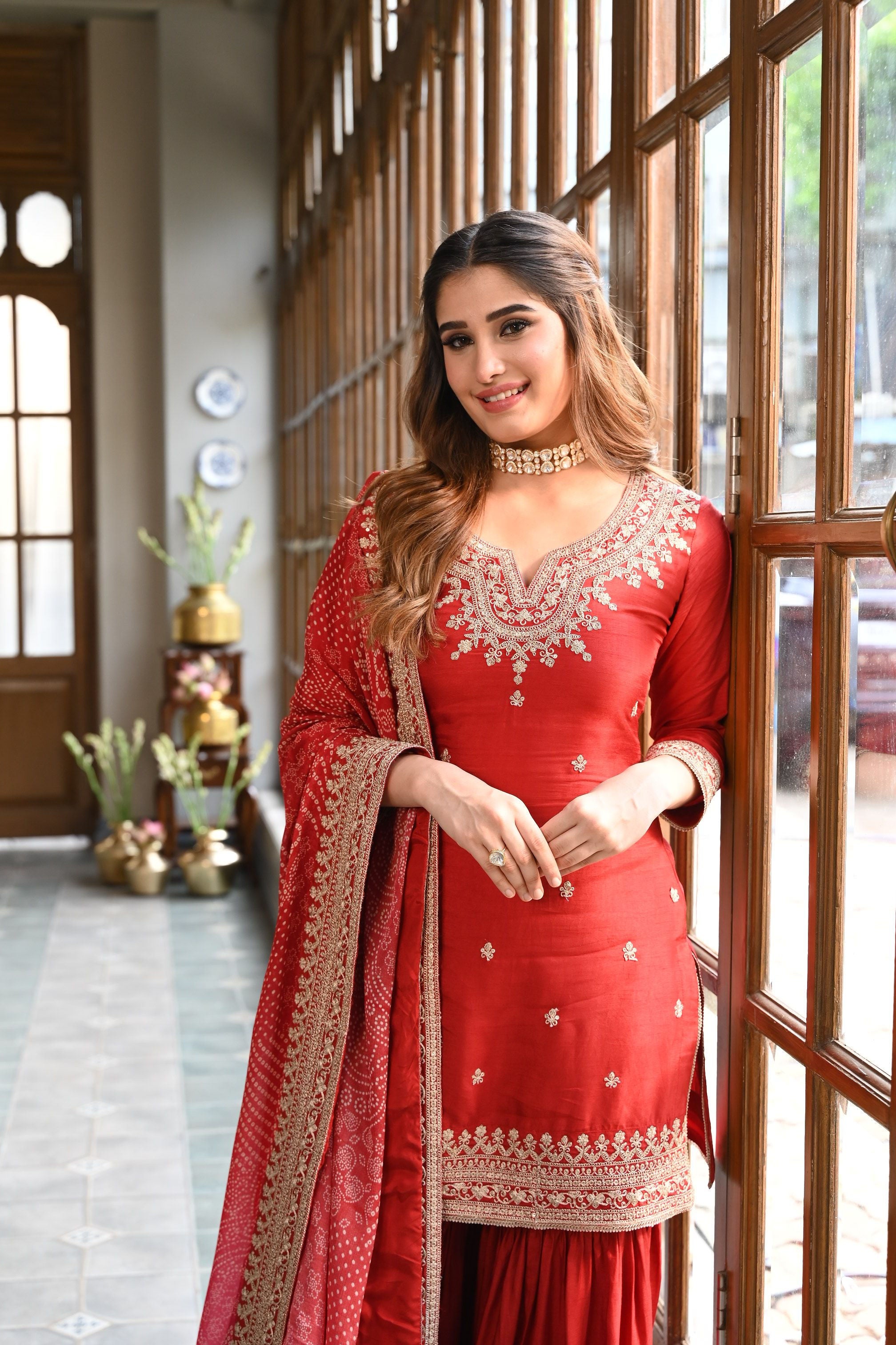 Turn heads with timeless elegance in our Red Pure Dola Silk Embroidered Gharara Set– a rich and regal ensemble designed for festive celebrations and traditional gatherings.
