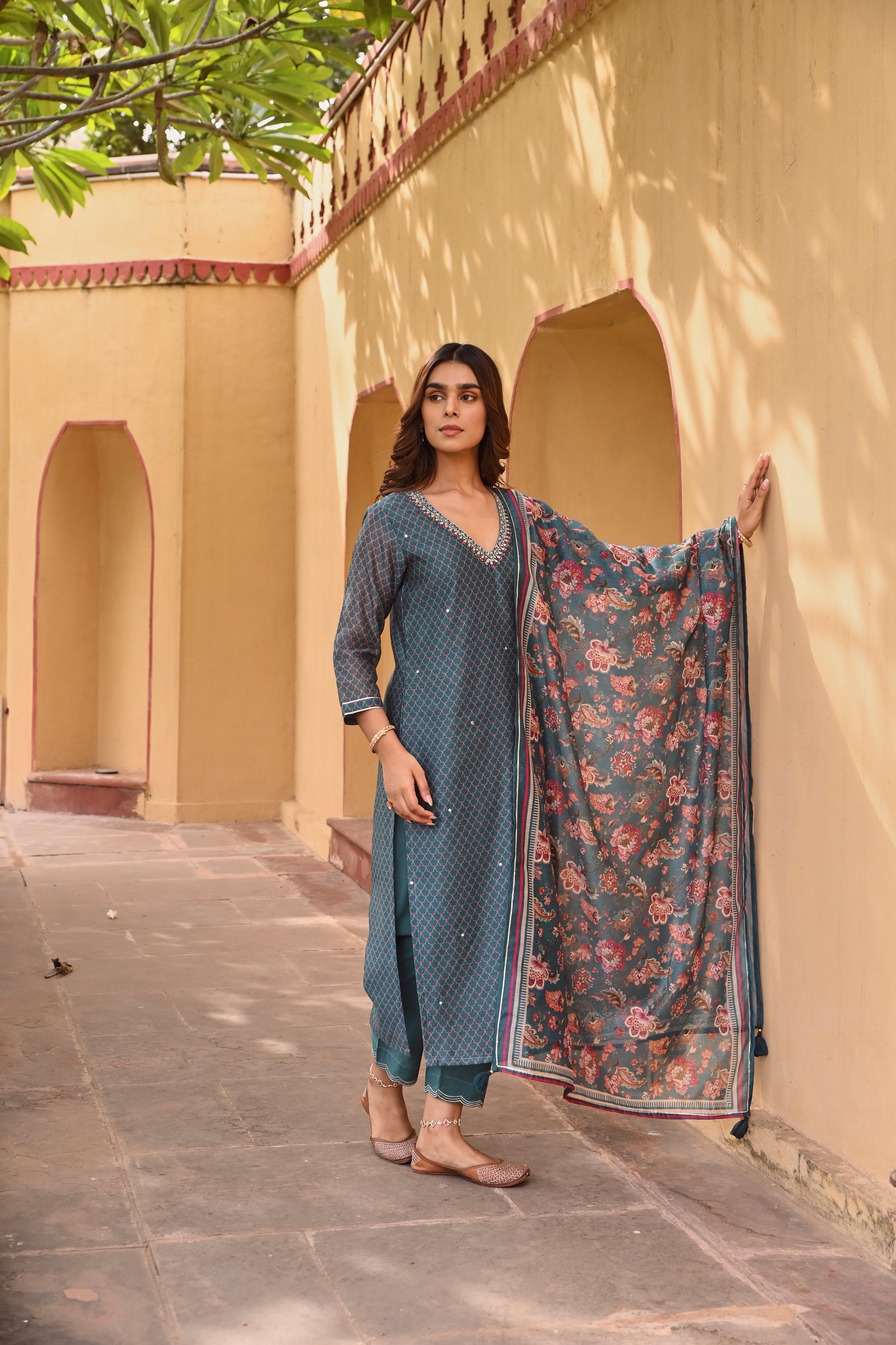 V-NECK TEAL GREEN CHANDERI KURTA SET