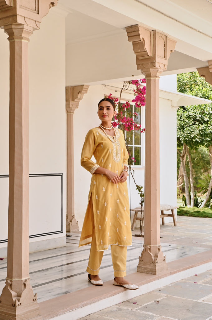 Yellow chikankari embroidery chanderi kurta with cotton pants & chikankari chanderi dupatta.