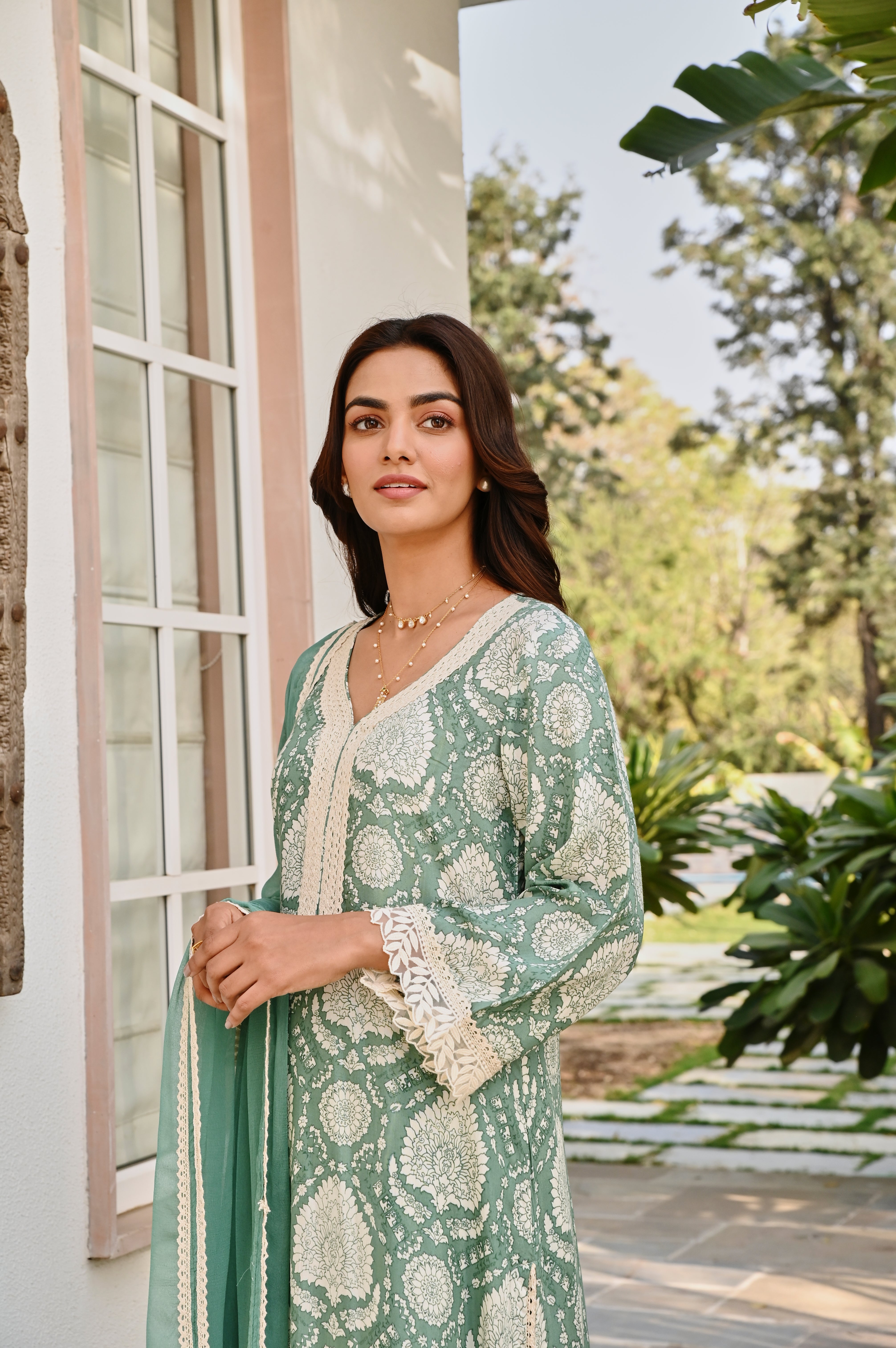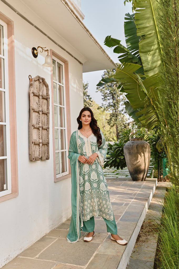 Aqua green schiffali Muslin kurta. Paired with lace edging chiffon dupatta and shantoon pants.
