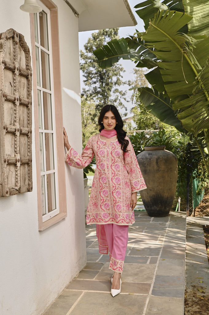 Pink jute print short kurta. Paired with cotton pants and doria dupatta with lace edging