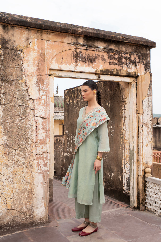 V-neck Pastel aqua green pure Crushed Tissue embroidered kurta. Paired with pants and floral printed shimmer dupatta.