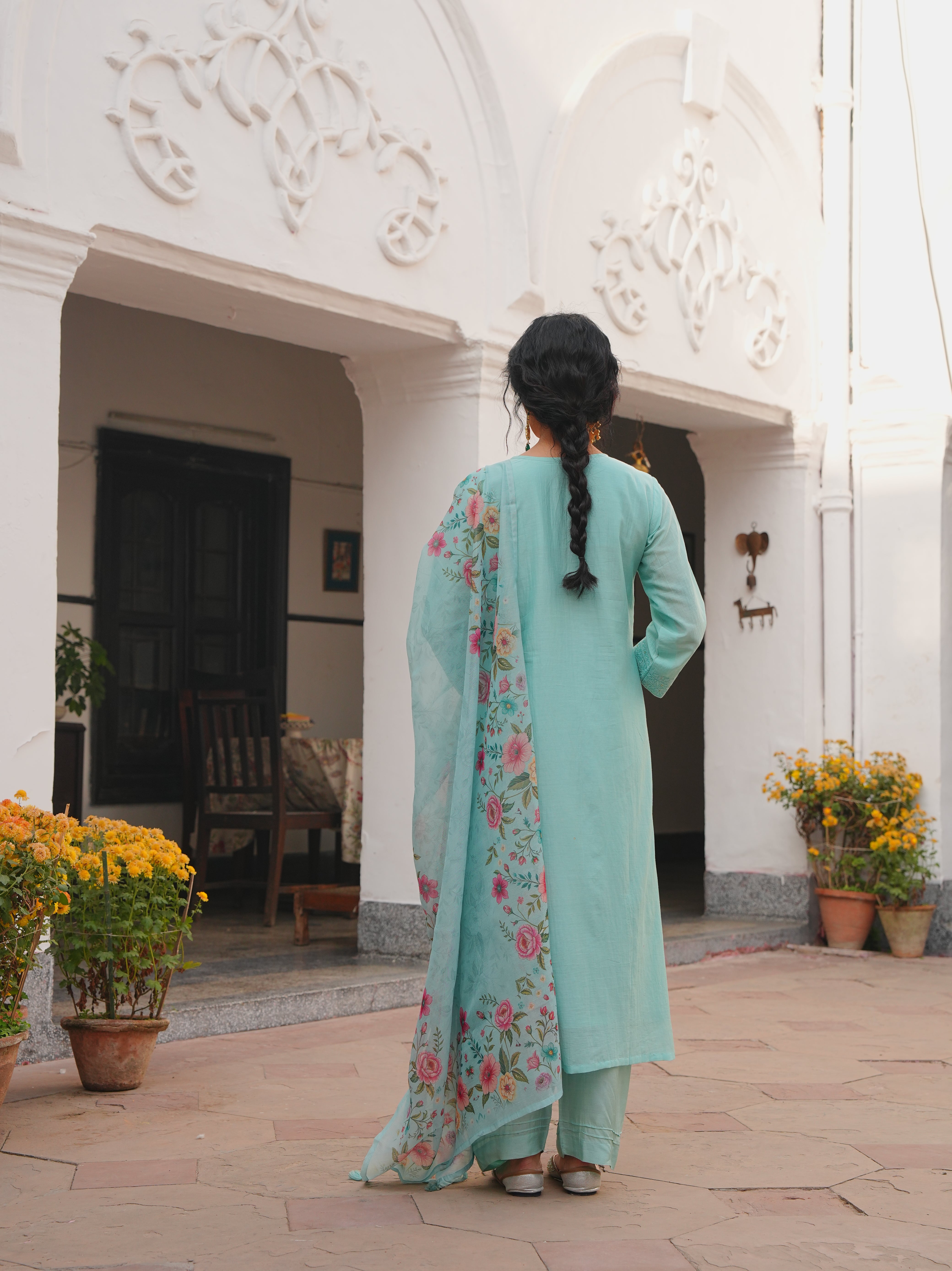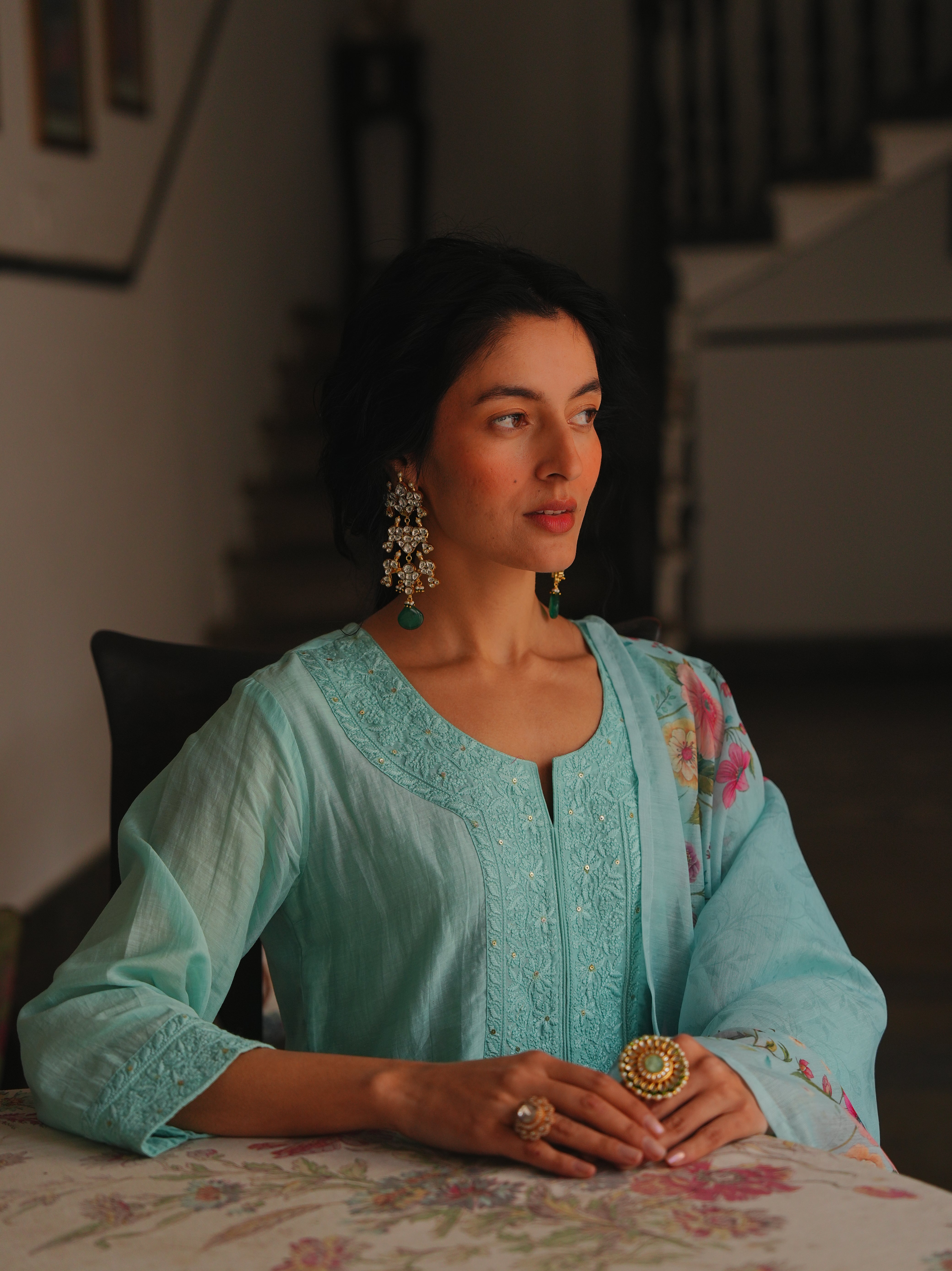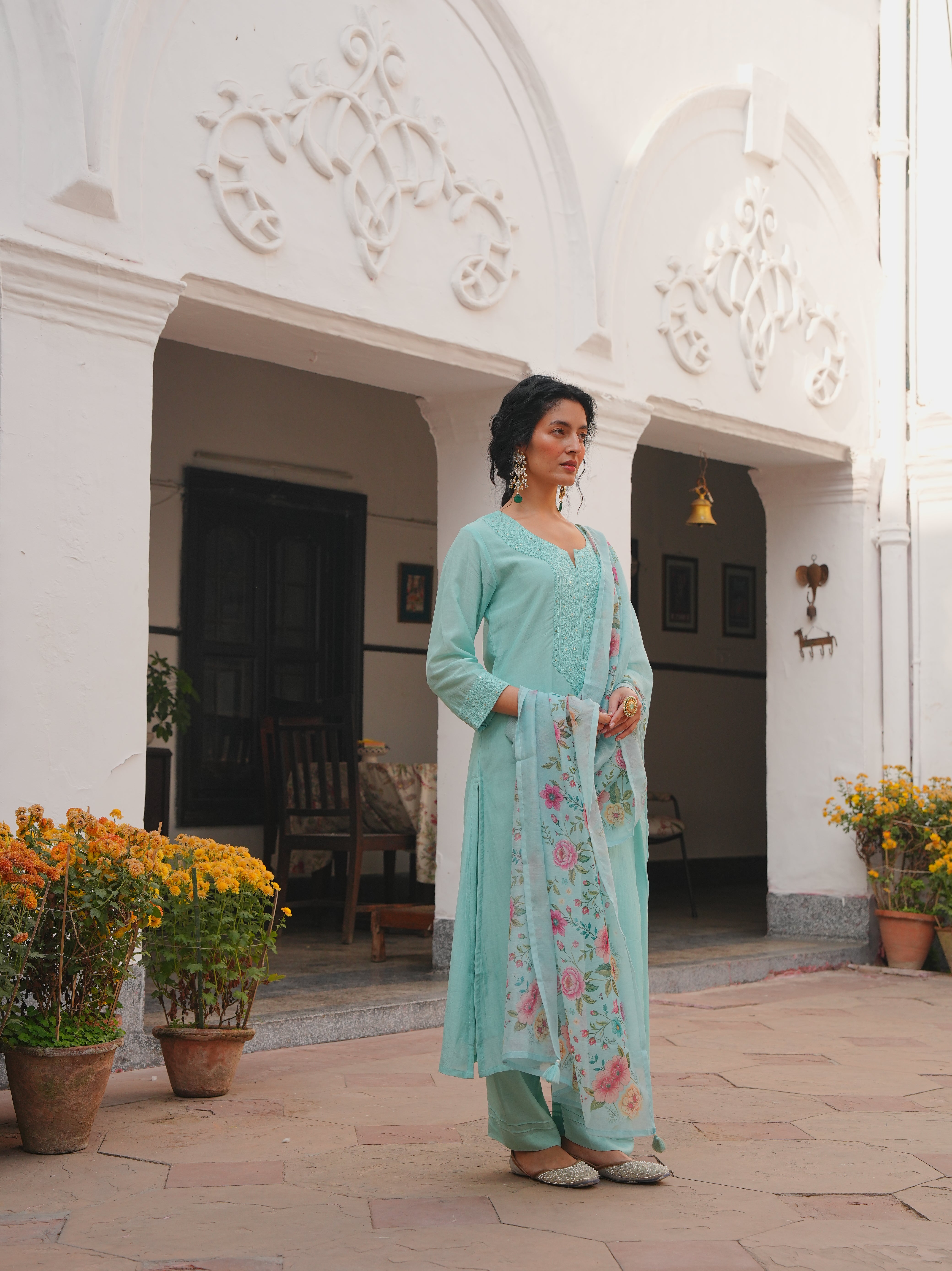 Step into timeless elegance with the Mint Aqua Mul Chanderi Kurta Set with Kota Doria Dupatta, a classic ensemble reimagined with modern grace.