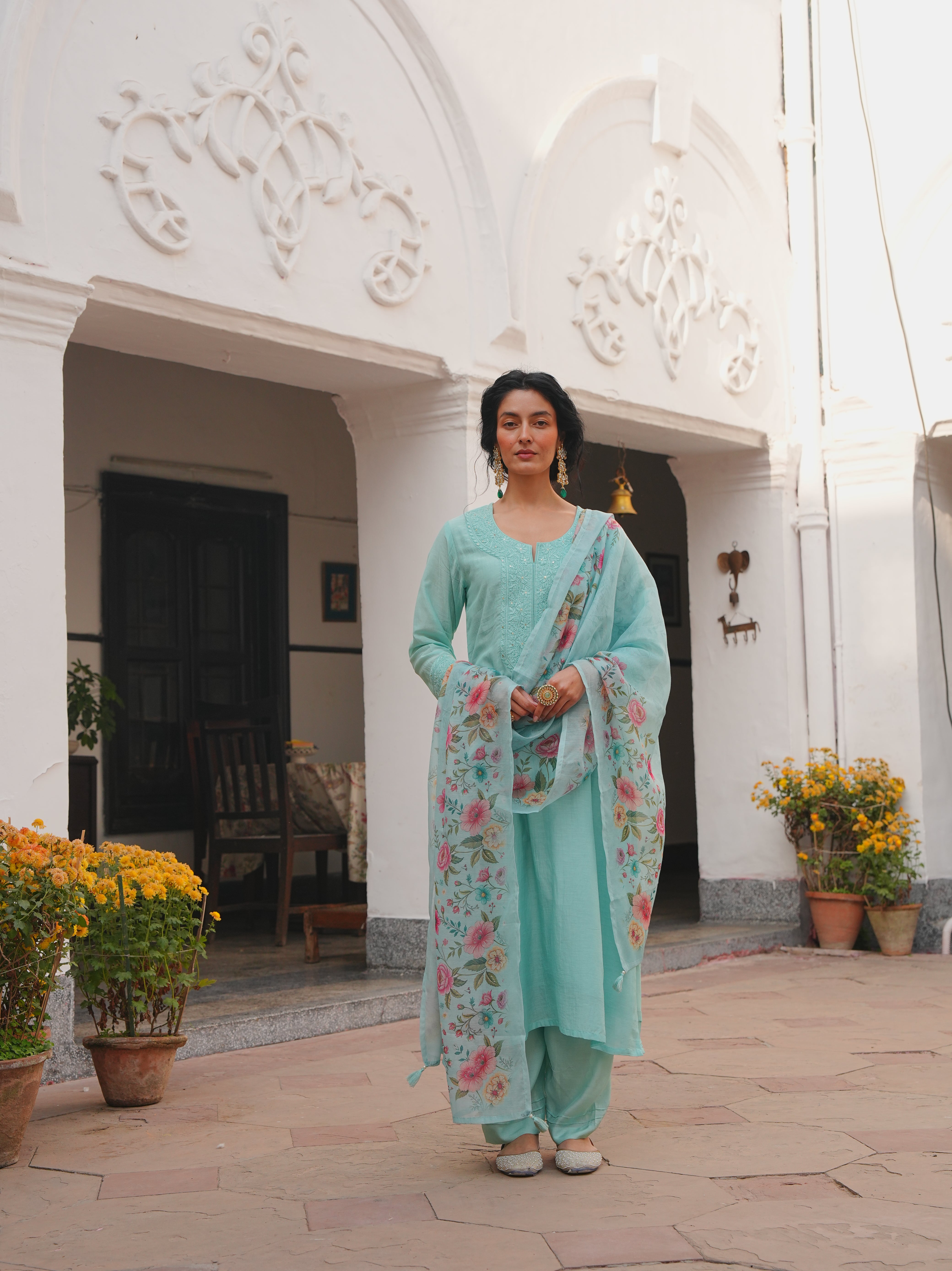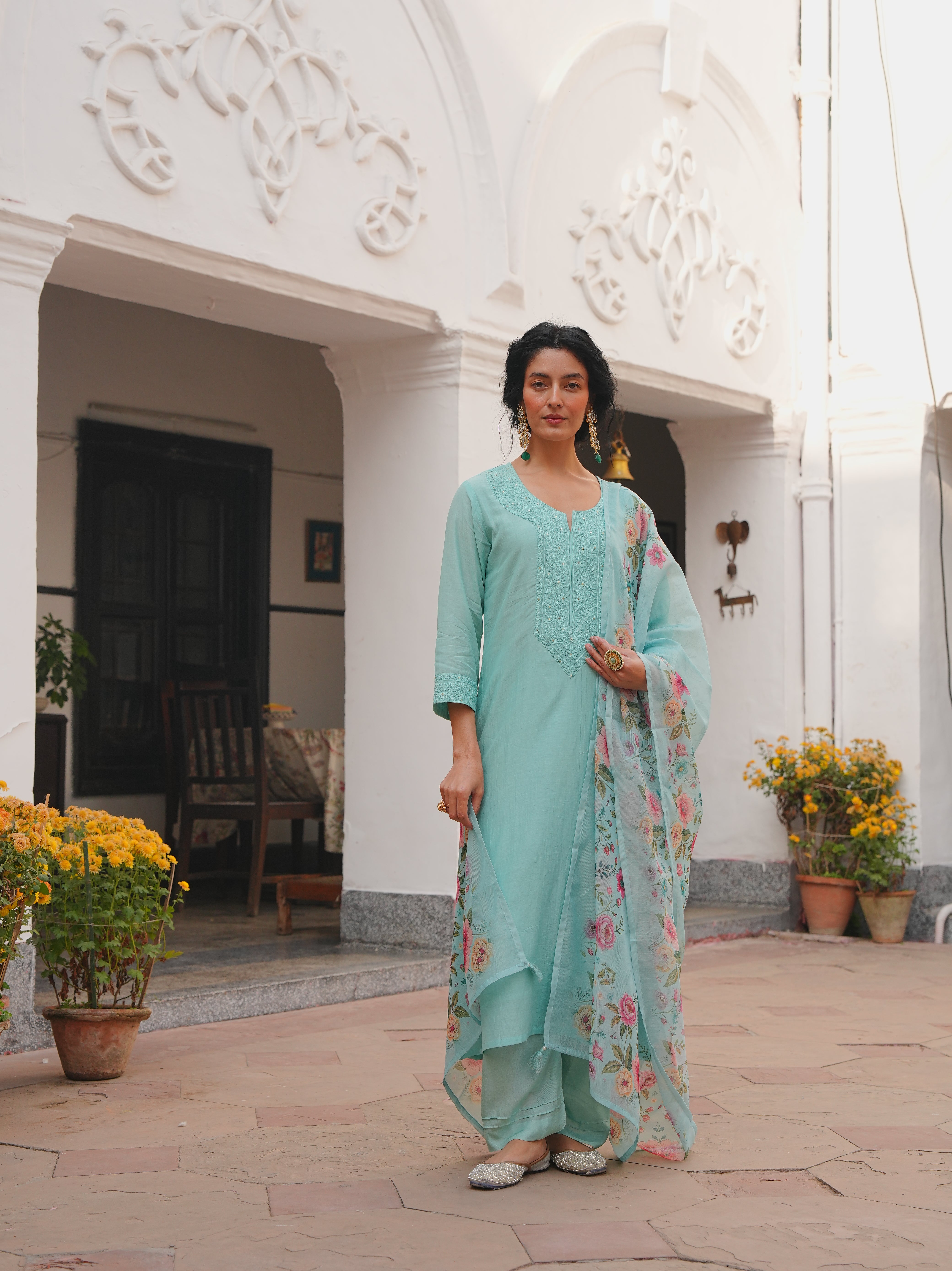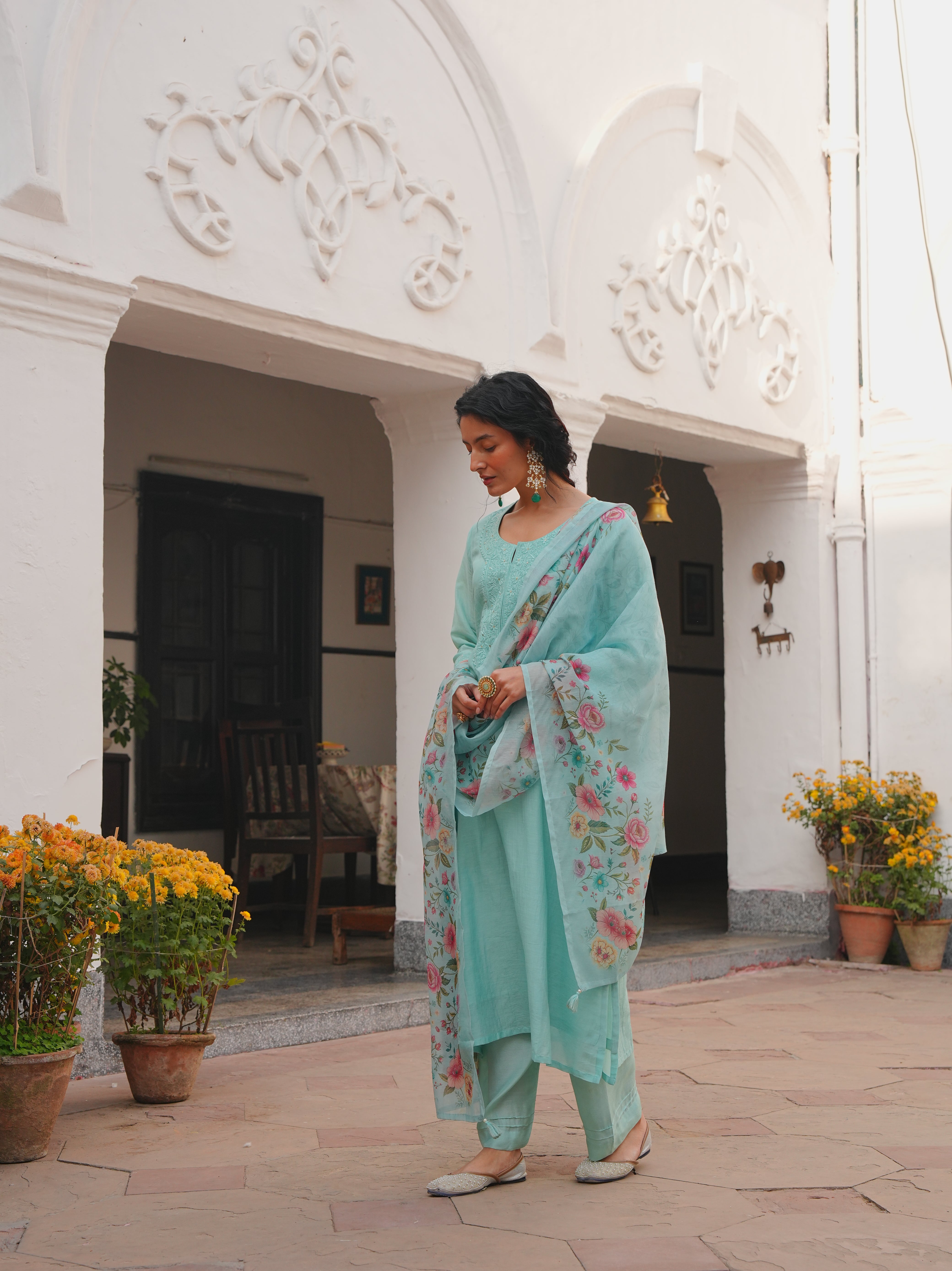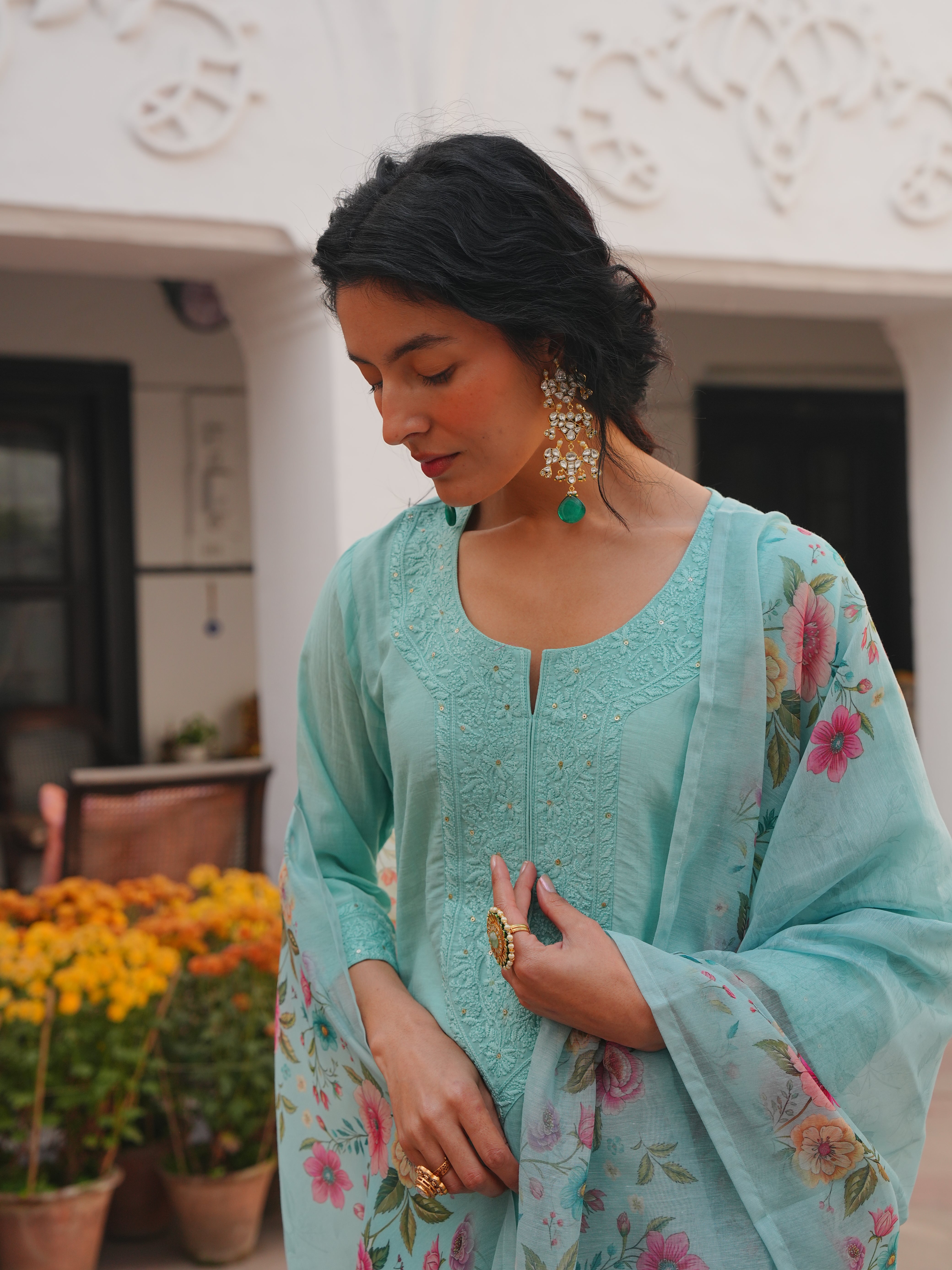 Step into timeless elegance with the Mint Aqua Mul Chanderi Kurta Set with Kota Doria Dupatta, a classic ensemble reimagined with modern grace.