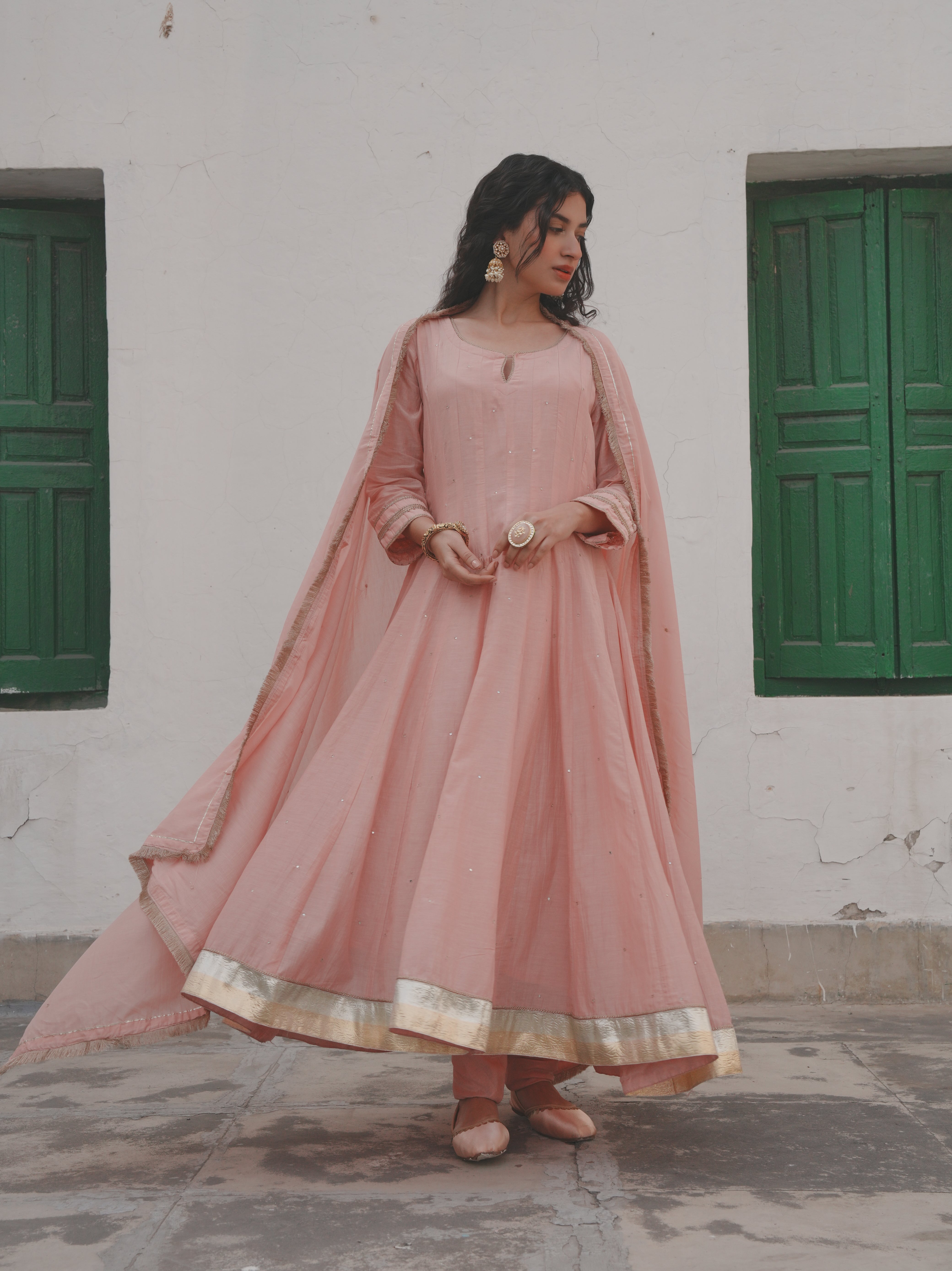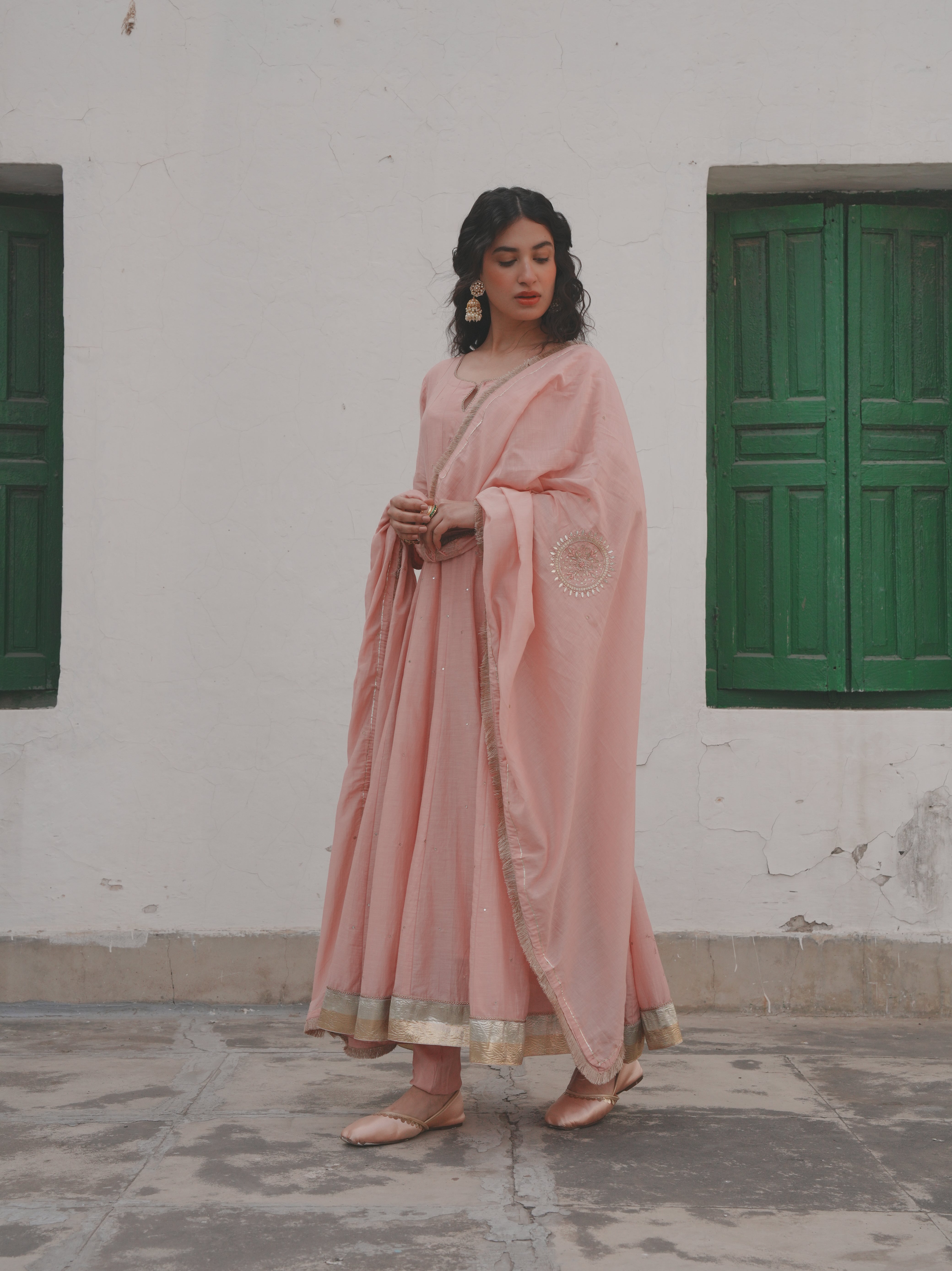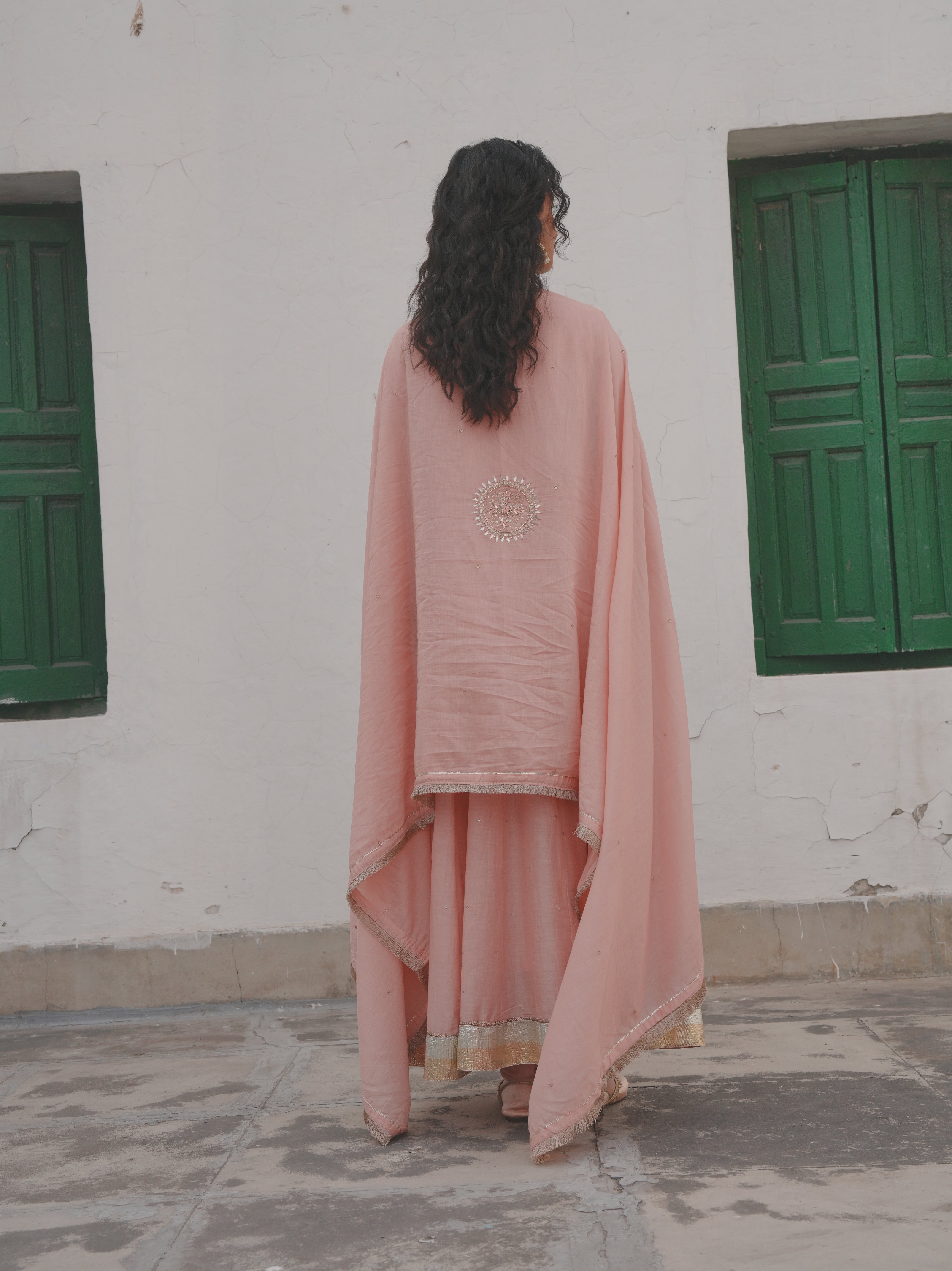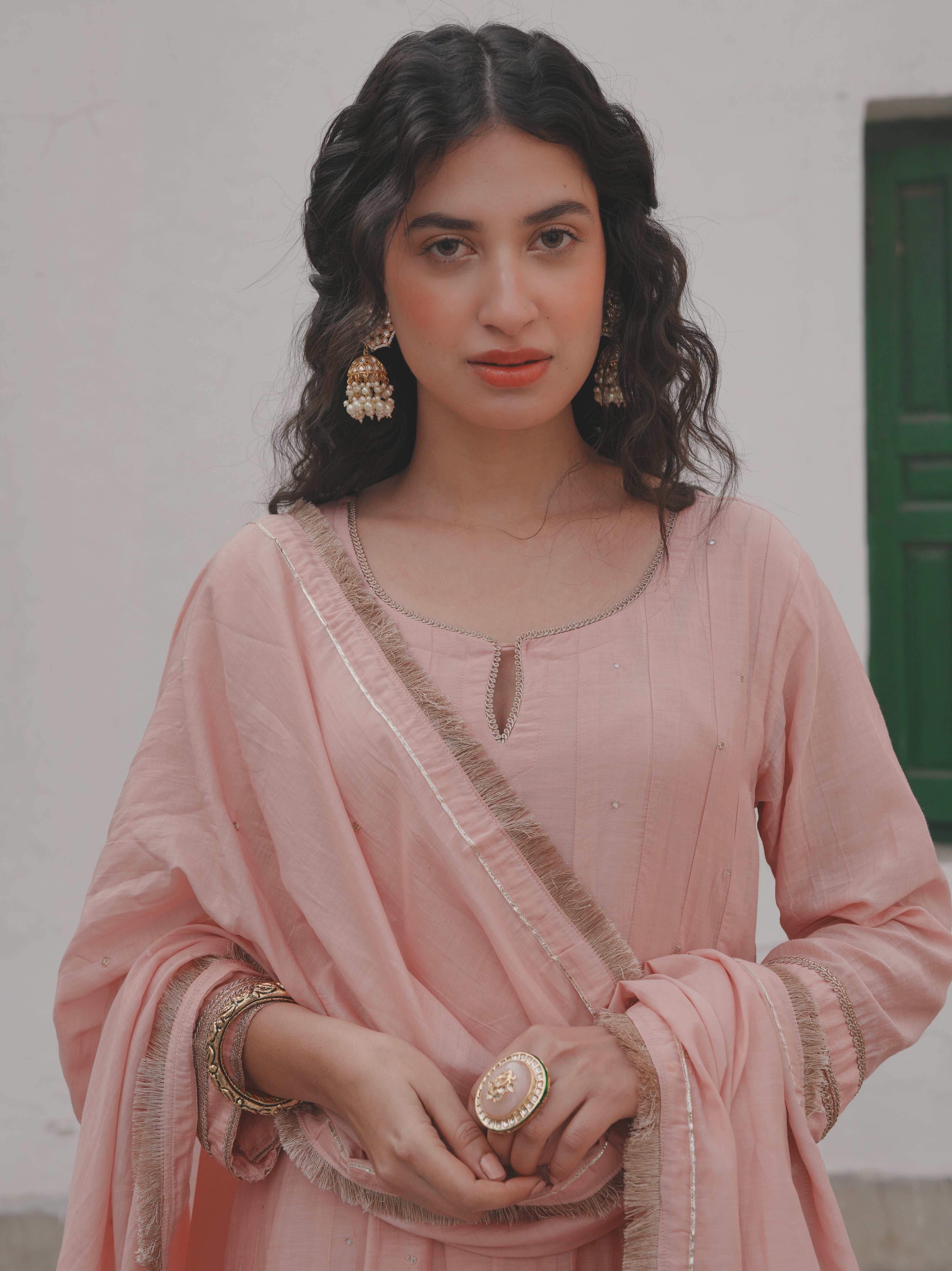 Step into timeless elegance with the Baby Pink Mul Chanderi Kurta Set with Mul Chanderi Dupatta, a classic ensemble reimagined with modern grace.