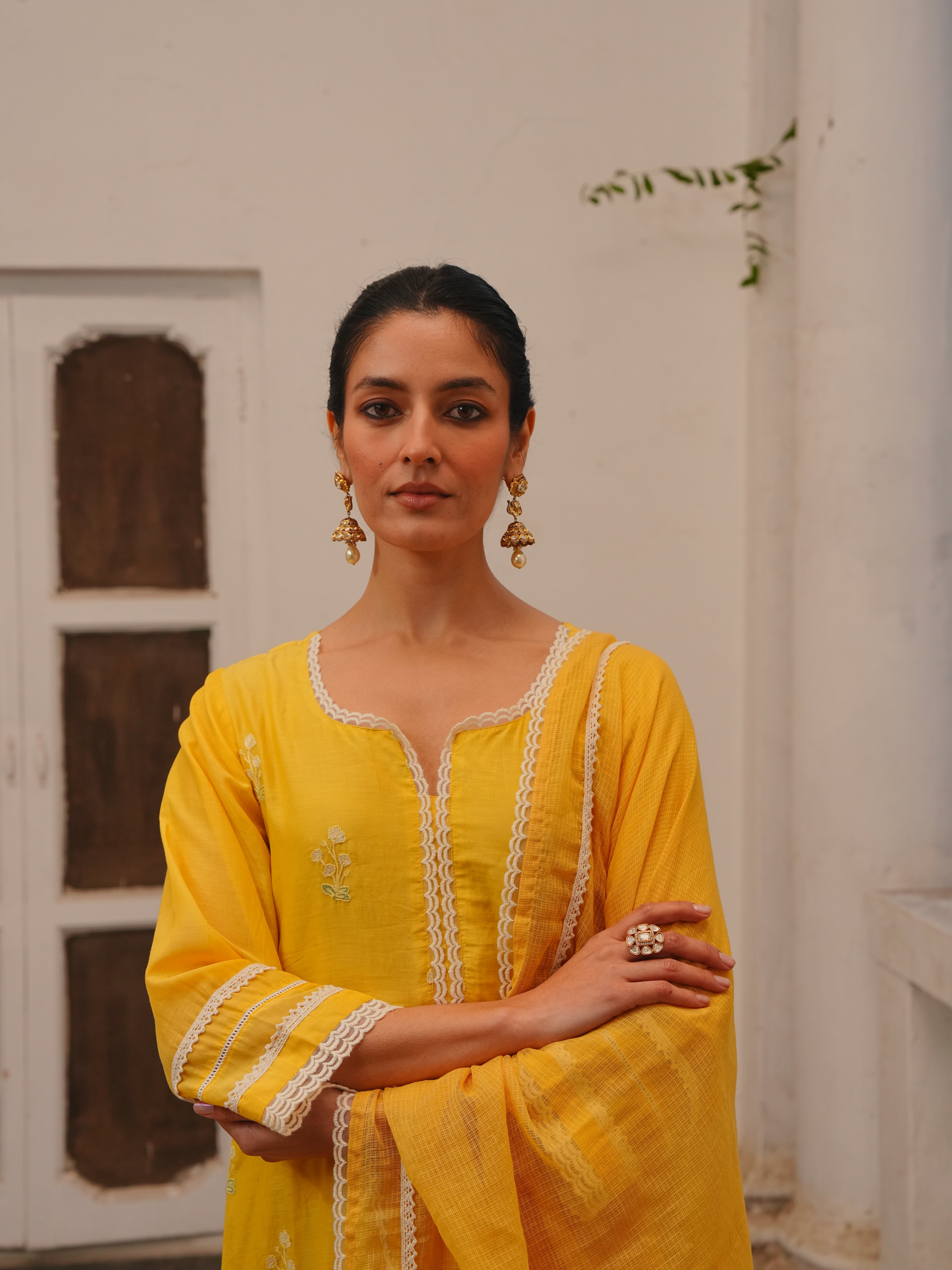 Step into timeless elegance with the marigold yellow Mul Chanderi Kurta Set with Kota Doria Dupatta, a classic ensemble reimagined with modern grace.