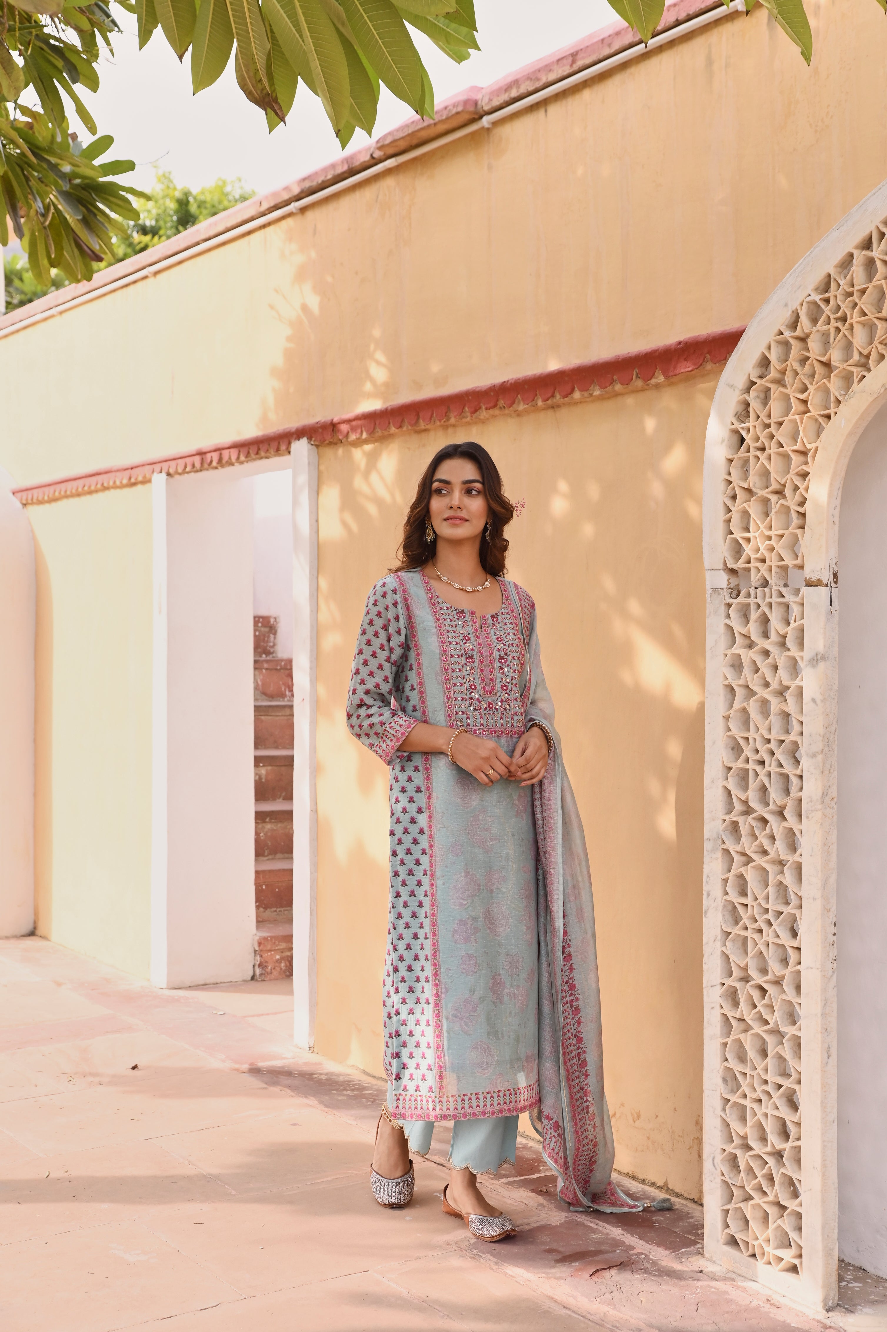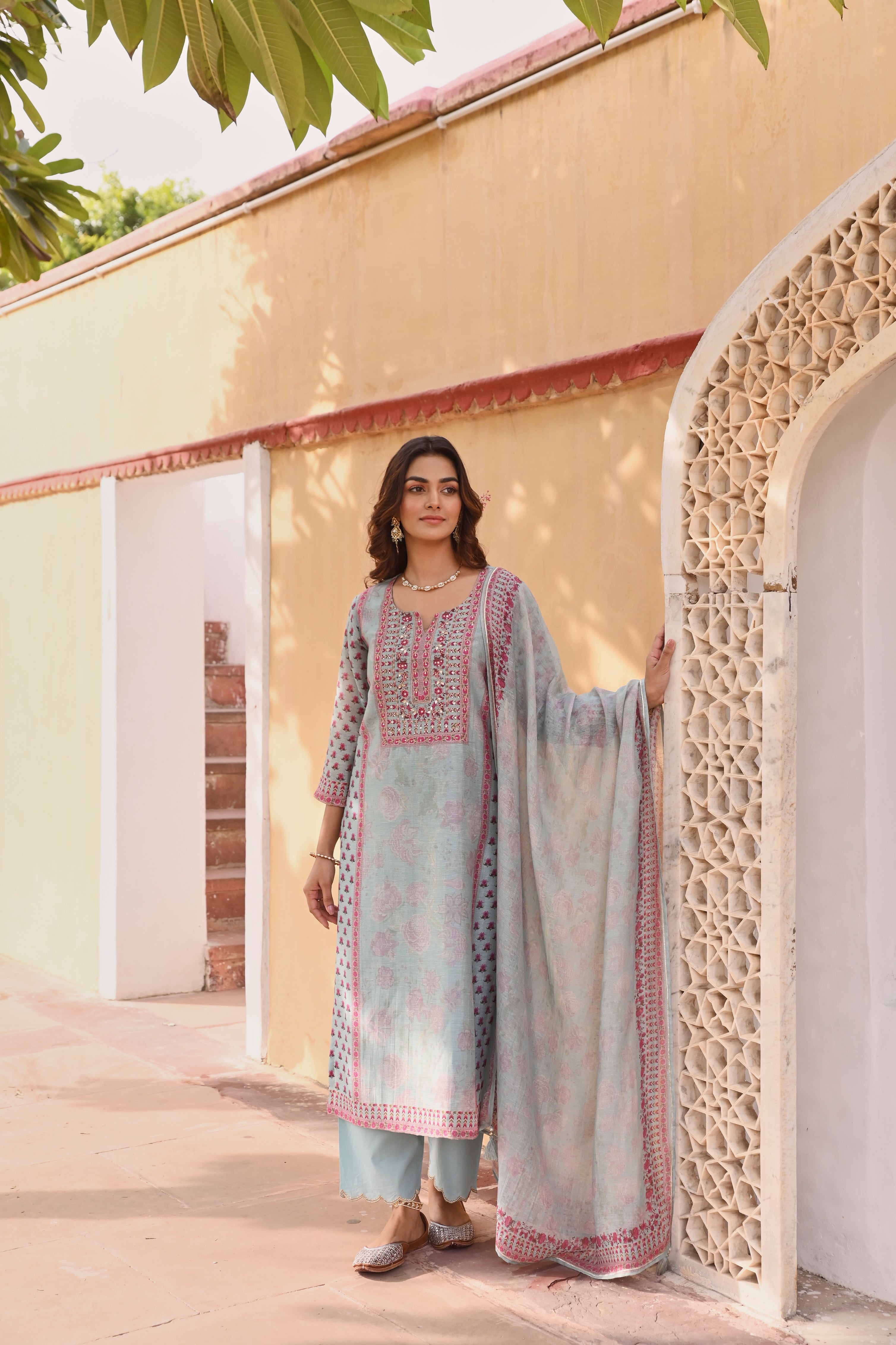 Powder Blue linen straight kurta with gota patti embroidery on neckline, paired with scalloped pants and printed dupatta with tassels on the edge.