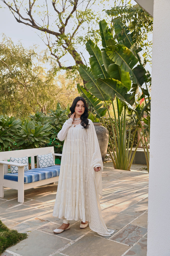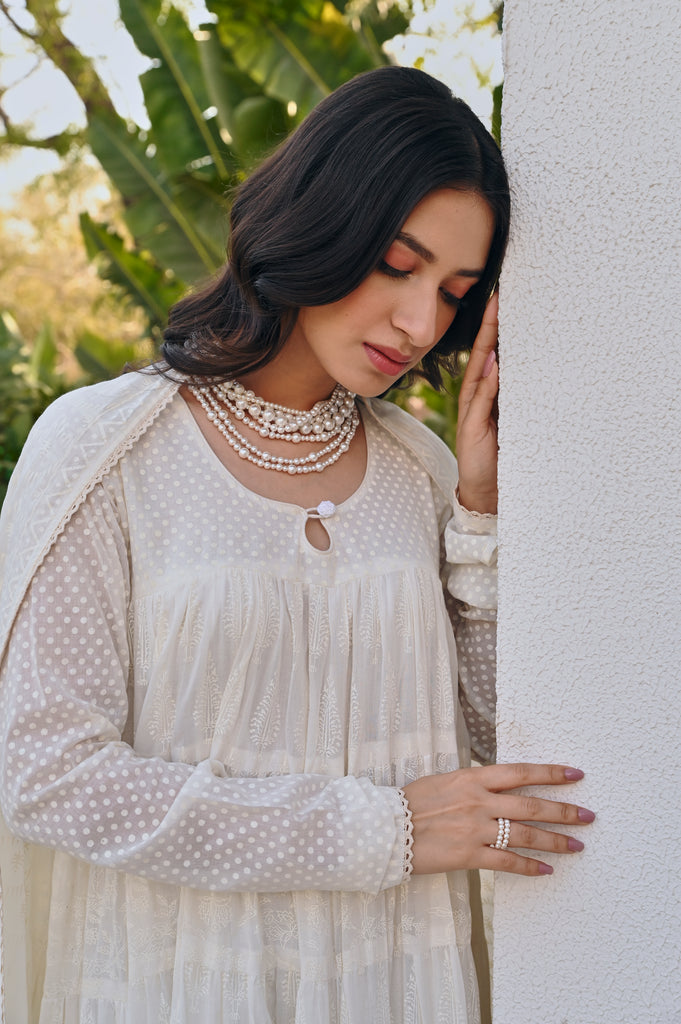Cream Jaal and Butta tiered Anarkali with full sleeves. Paired with churidaar and jaal print dupatta.