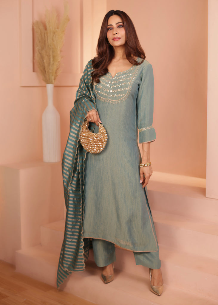 DUSTY TEAL CRUSHED TISSUE KURTA SET