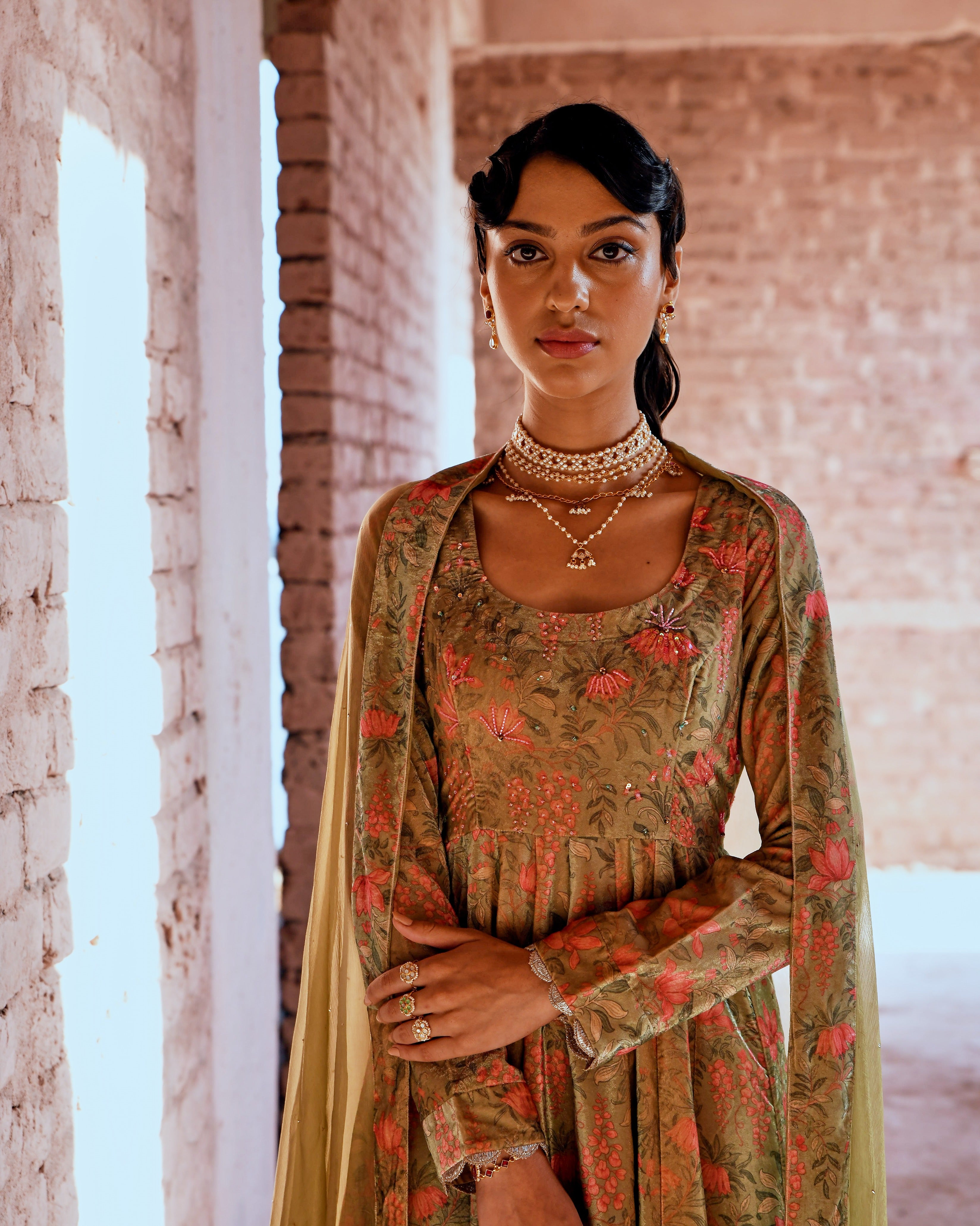 OLIVE GREEN FLARED MAKHMAL ANARKALI SET